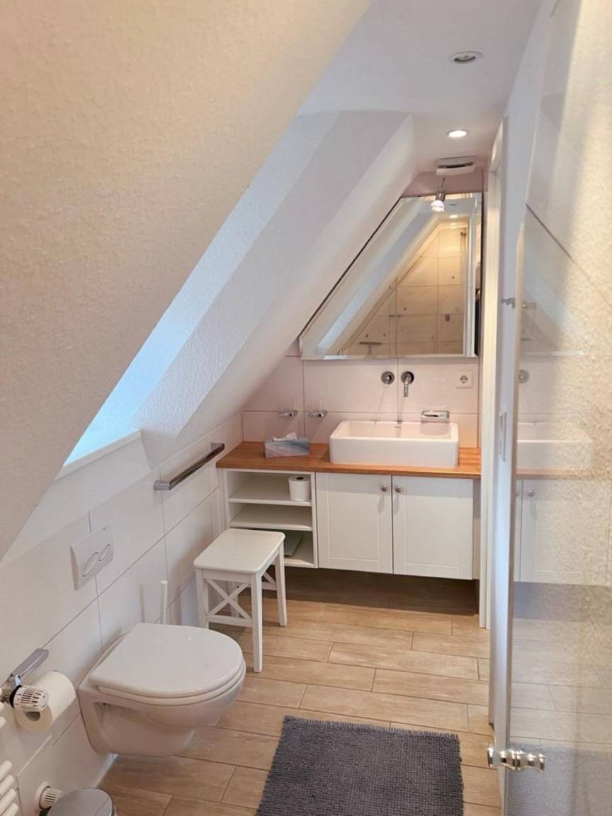 Im Obergeschoss: 1 Schlafzimmer mit Doppelbett , 1 Schlafzimmer mit 2 breiten Einzelbetten, Duschbad/WC.
