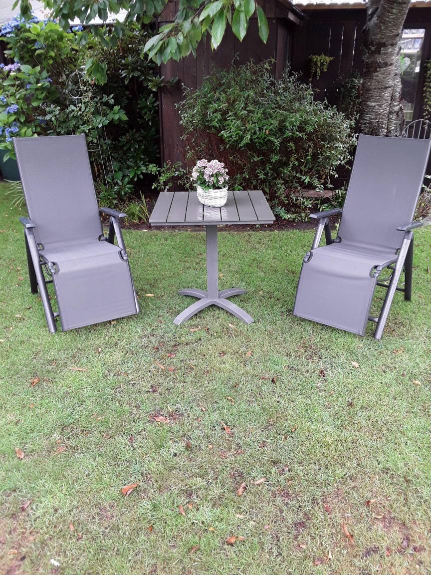 2 Liegestühle mit Tisch stehen im Garten, Auflagen in der Truhe auf der Terrasse.