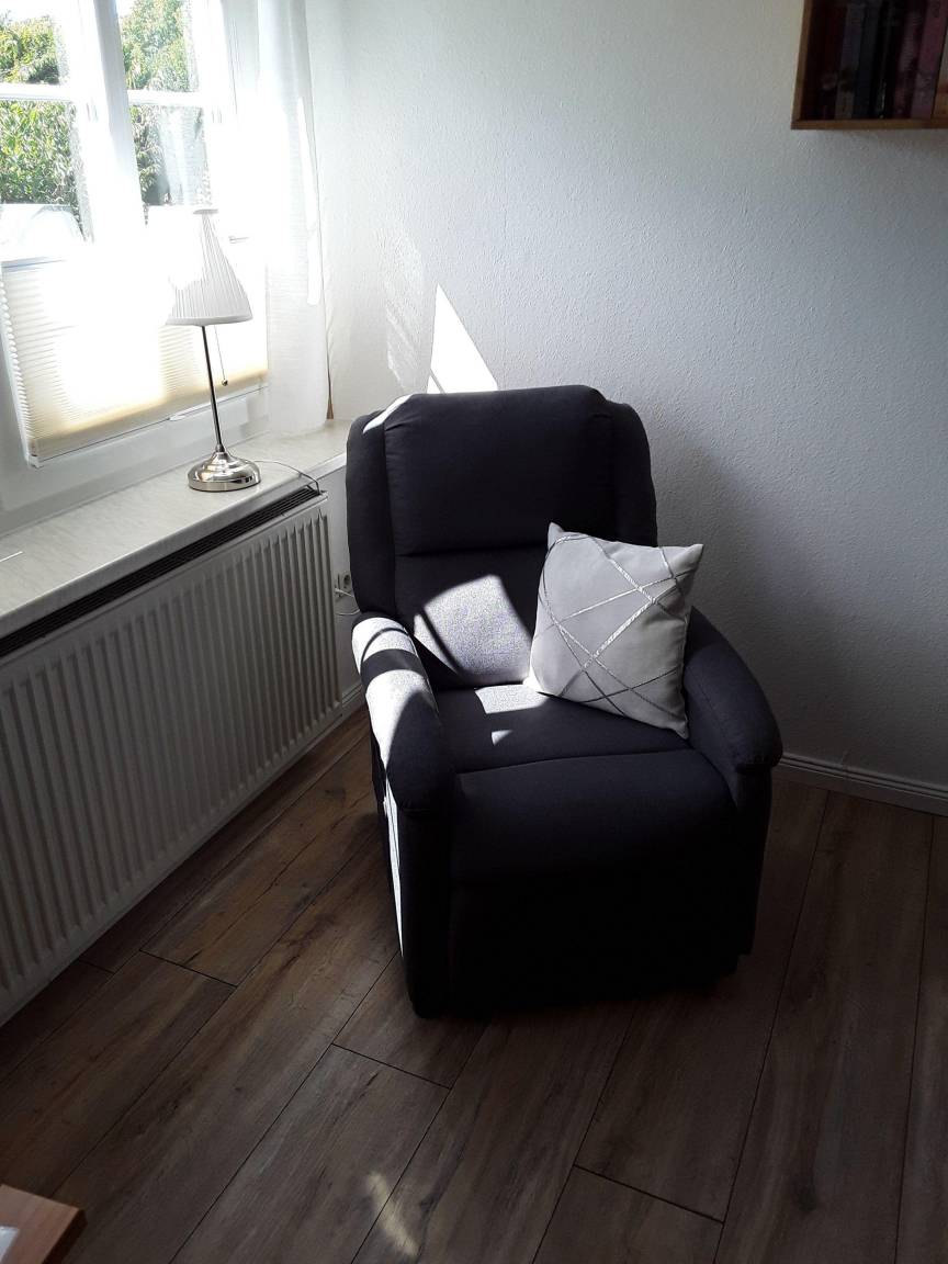 Darin steht eine Eck Couch, Ohrensessel mit Hocker, Flach Bildschirm (Sat -TV ), DVD Player, Spiele, Bücher und W-Lan.