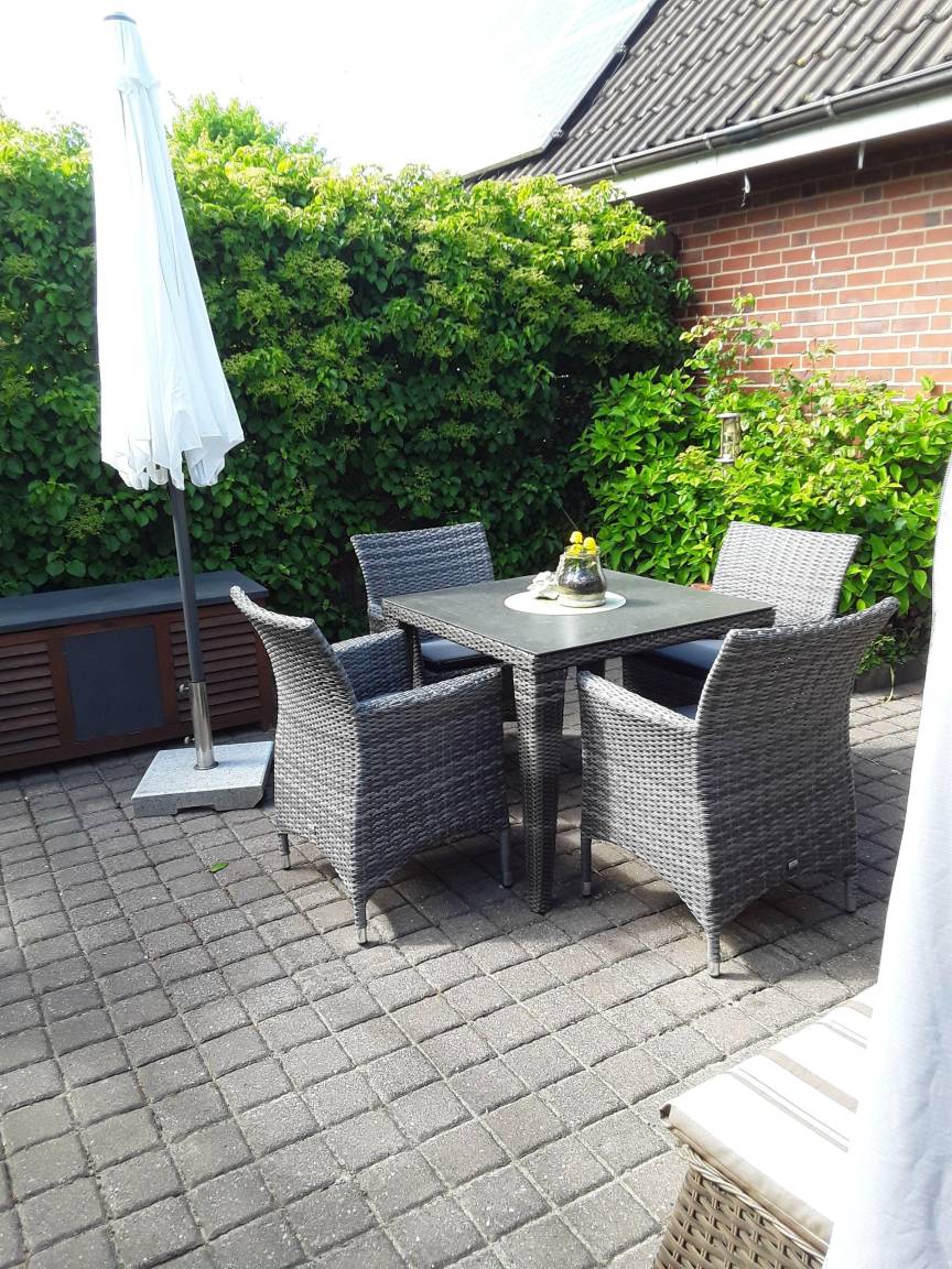 Auf der Terrasse stehen Gartenstühle, Tisch, Sonnenschirm und Auflagen, die befinden sich in der Truhe.