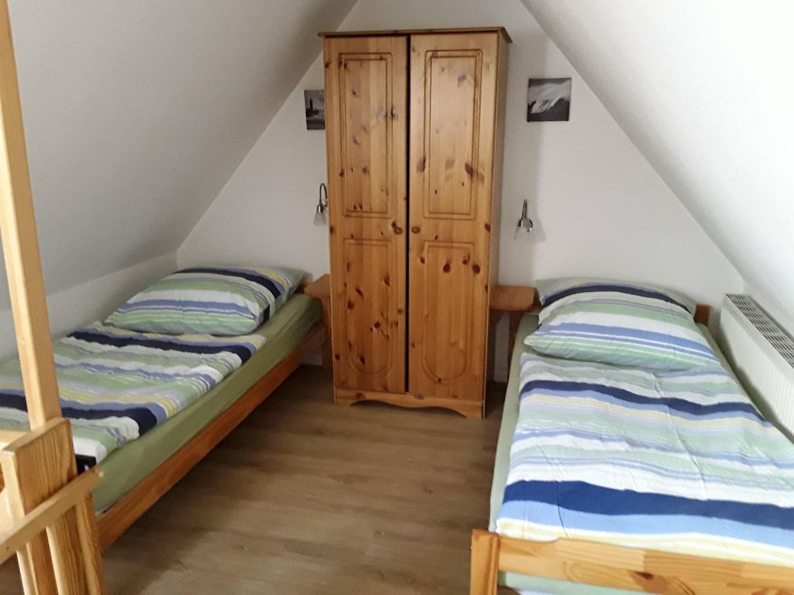 2 Einzelbett je 0,90m x 2,00m, 2 türiger Kleiderschrank , 1 Wäscheschrank und Verdunkelungsrollo.