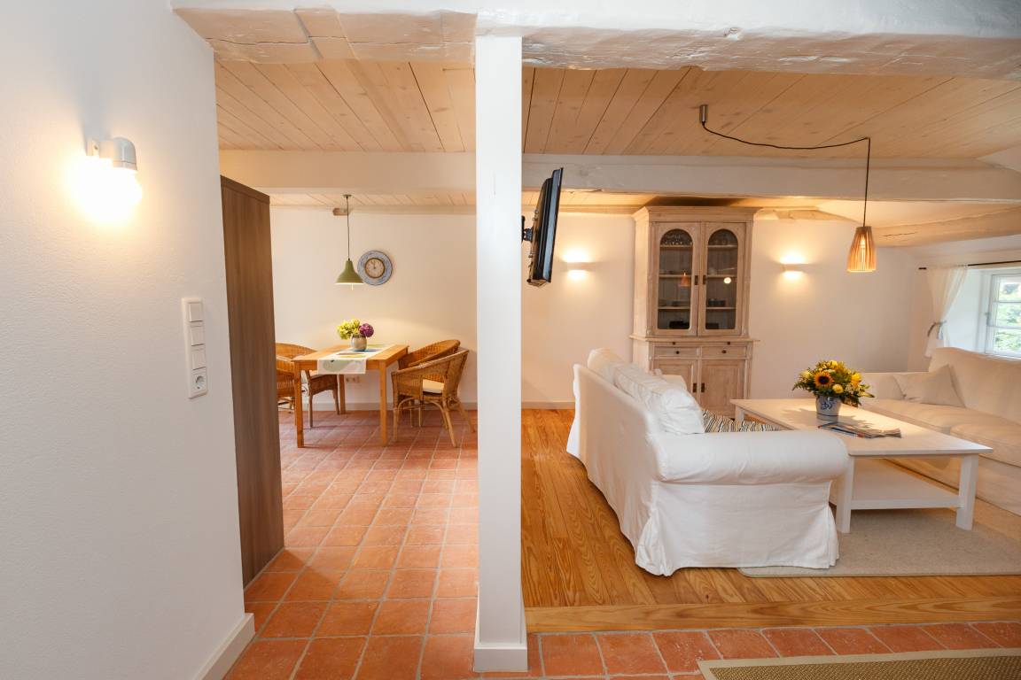 Das Ferienhaus Stall ist Teil des Bauernhauses Borgsum, zu dem auch die Hausteile "Scheune" und "Pesel" gehören. Es eignet sich als "Großfamiliendomiziel". Wenn alle drei Hausteile gemietet werden, können bis zu 14 Personen im Objekt Platz finden.