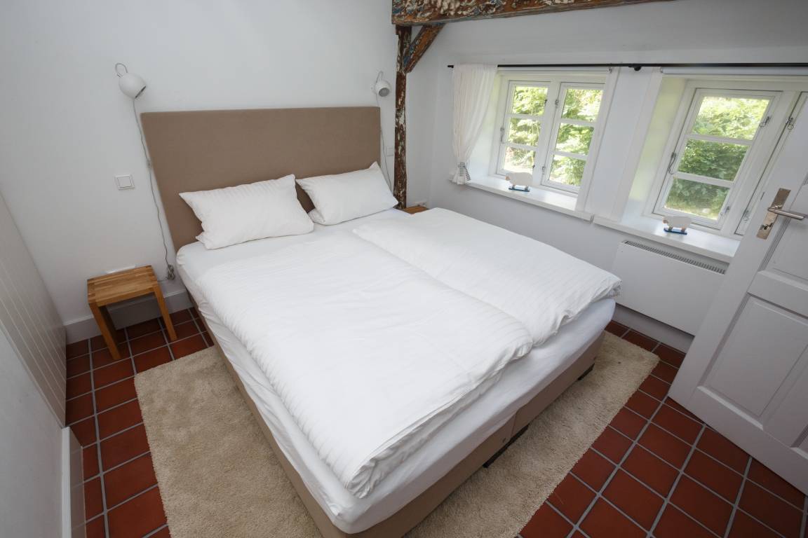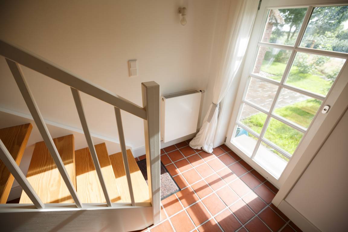 Es handelt sich um eine ca. 95 qm große Ferienwohnung über zwei Etagen mit zwei Schlafzimmern und einer Schlafkajüte. Ein Schlafzimmer mit Doppelbett findet man im Erdgeschoss. Entlang dem Flur mit Garderobe und Gäste-WC gelangt man in die komfortabel ausgestattete, offene Küche mit großem Esstisch und das anschließende, helle und moderne Wohnzimmer.Über eine breite Holztreppe erreicht man das Obergeschoss. Dort befindet sich ein großes Doppelbett-Schlafzimmer, ein großzügiges Duschbad und eine abtrennbare Schlafkajüte von 1,40 Meter Breite, die ideal für Kinder ist.