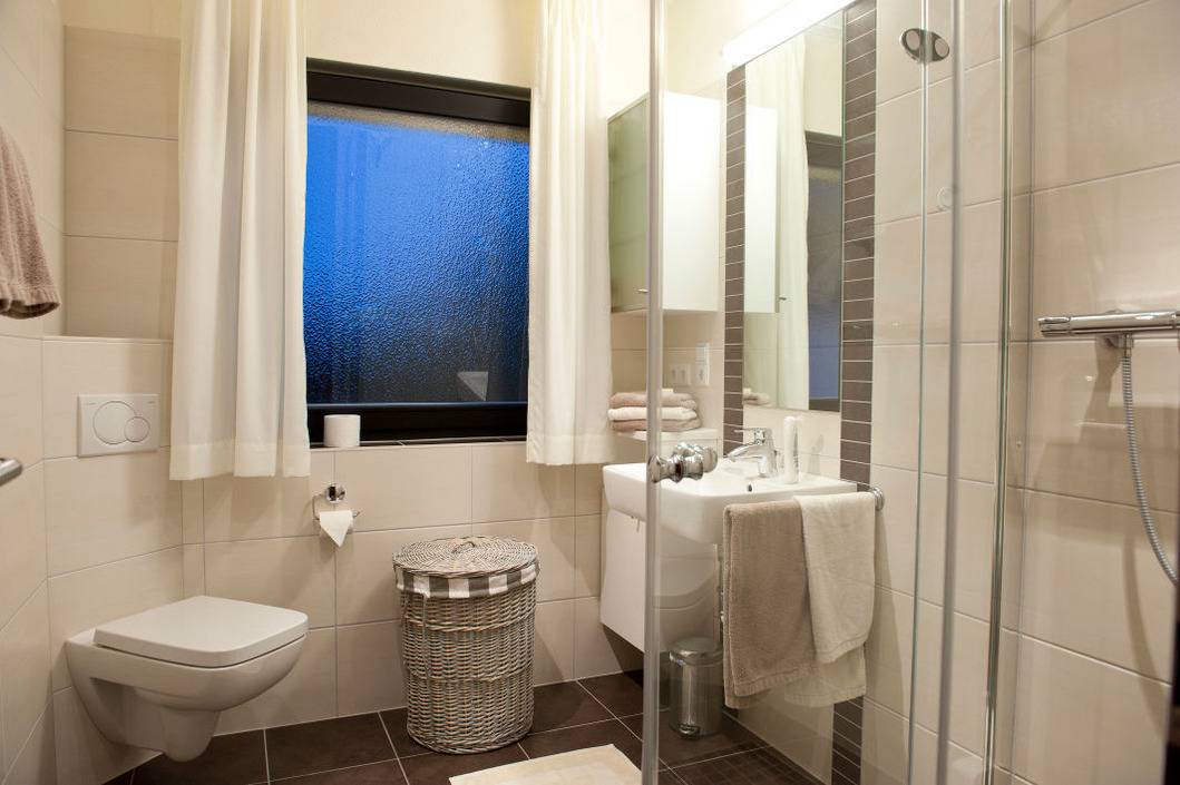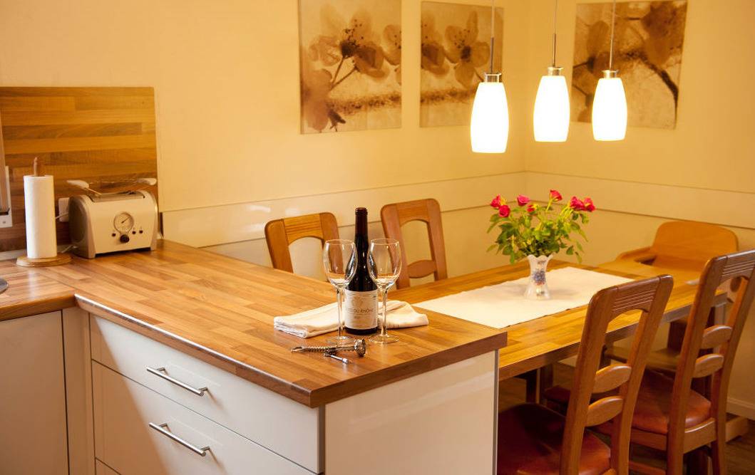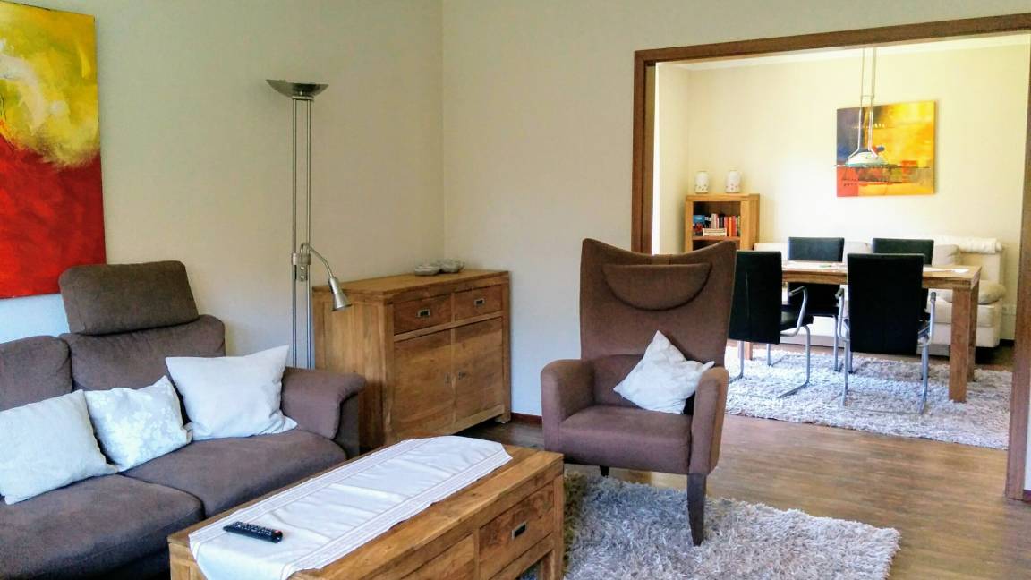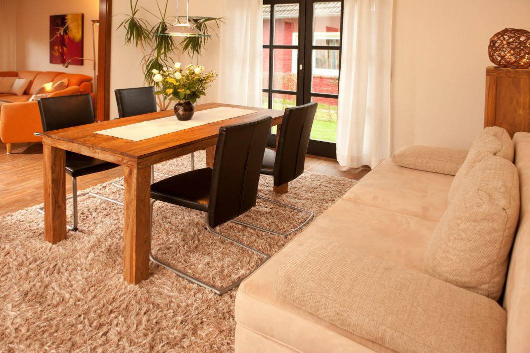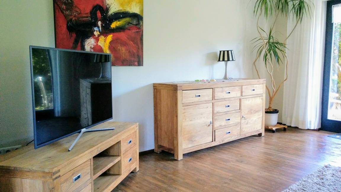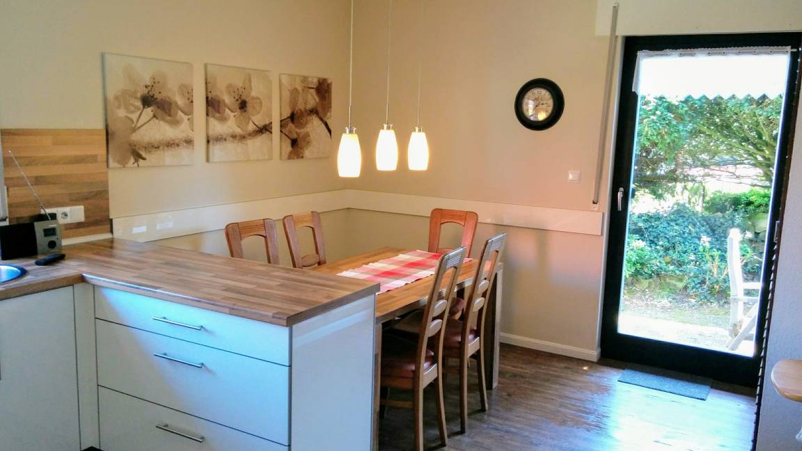 Ein großer Esstisch bietet Platz für bis zu sechs Personen und wird auch gerne für ausgiebige Spielnachmittage bei Regenwetter genutzt. Der Mittelpunkt dieser geräumigen Ferienwohnung ist das Wohnzimmer mit einer großen Couchgarnitur für bis zu sechs Personen und einem Flachbildfernseher. Durch eine Glastür gelangen Sie auf die Terrasse, die durch einen bepflanzten Wall herrlich geschützt ist. Mit einer Tasse Kaffee oder einem Glas Wein kann man es sich hier in den schönen Teakholzmöbeln gut gehen lassen. Zugang zur Terrasse haben Sie auch von der Küche. Hier bietet die von einem Tischler maßgefertigte Küche allen Komfort, den Sie für die Zubereitung von Mahlzeiten benötigen. Für das gemeinsame Kochen sind Ihnen Koch-Ceranfeld mit Backofen, Mikrowelle, Kühlschrank mit Gefrierfach, Kaffeemaschine, Wasserkocher und vieles mehr sicher sehr hilfreich. Selbstverständlich verfügt auch diese Küche über eine Spülmaschine. Das hochwertige Badezimmer ist mit einer ebenerdigen großen Dusche (Glastüren als Abtrennung), einem WC und einem Wachbecken ausgestattet. Die Fußbodenheizung sorgt für angenehme Wärme im Winter.
