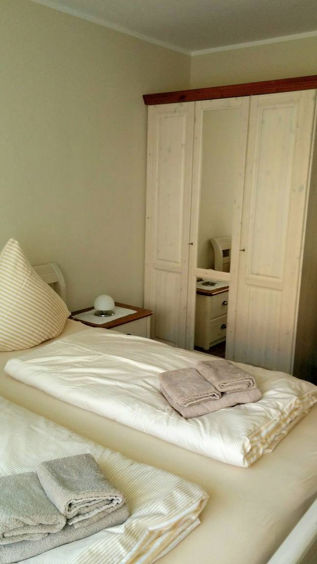 Die Ferienwohnung im Erdgeschoss ist 100 m² groß und bietet Platz für bis zu fünf Personen. Die Wohnung umfasst zwei Schlafzimmer - das eine mit Doppelbett, das andere mit zwei Einzelbetten und einem fest eingebautem Hochbett - ein besonderer Spaß für alle Kinder. Reisekinderbetten mit einer verstärkten Matratze stehen selbstverständlich zur Verfügung und werden gerne für Sie aufgebaut.