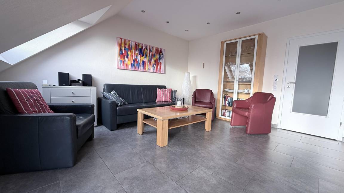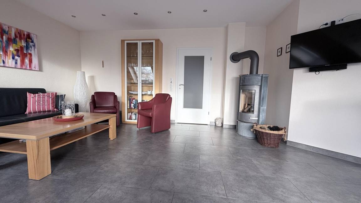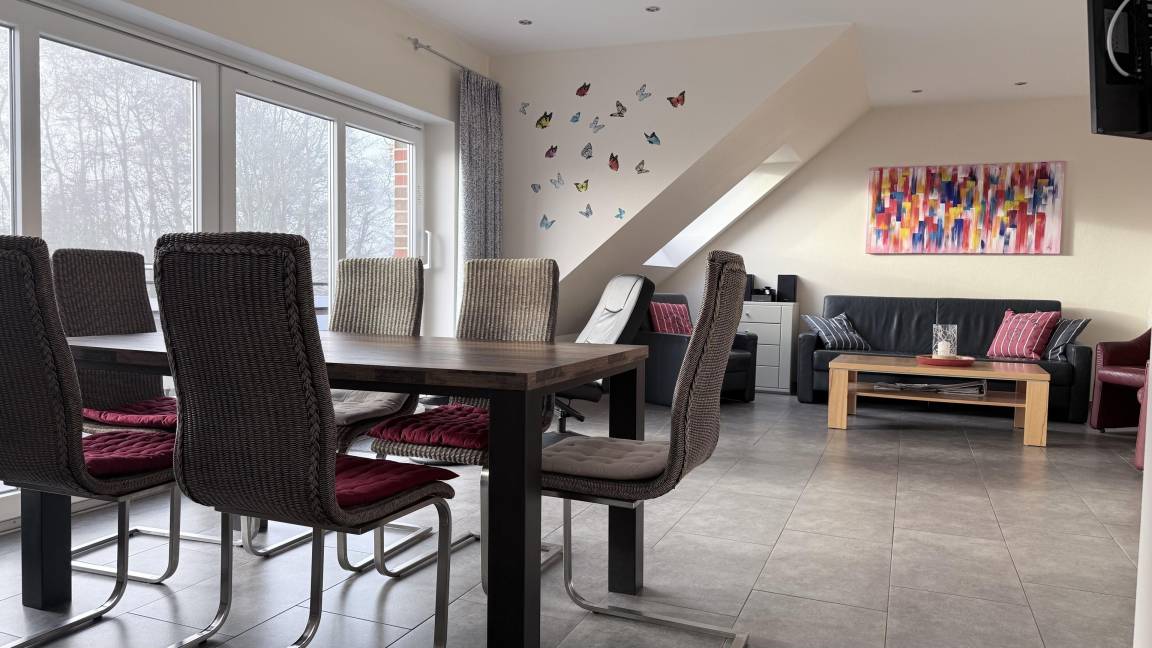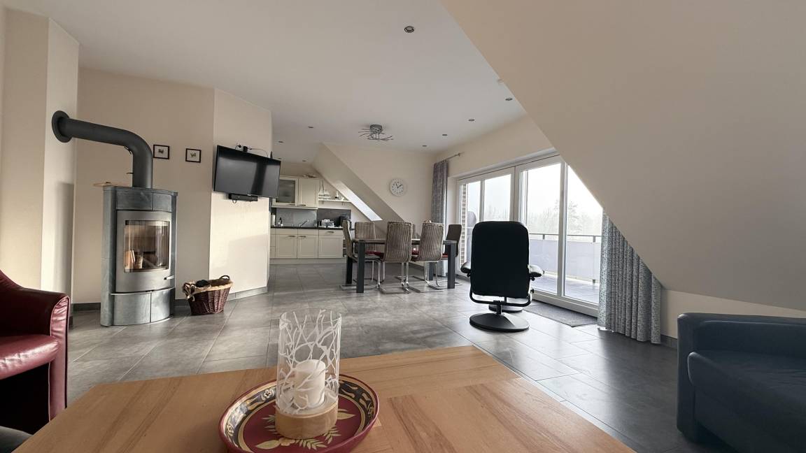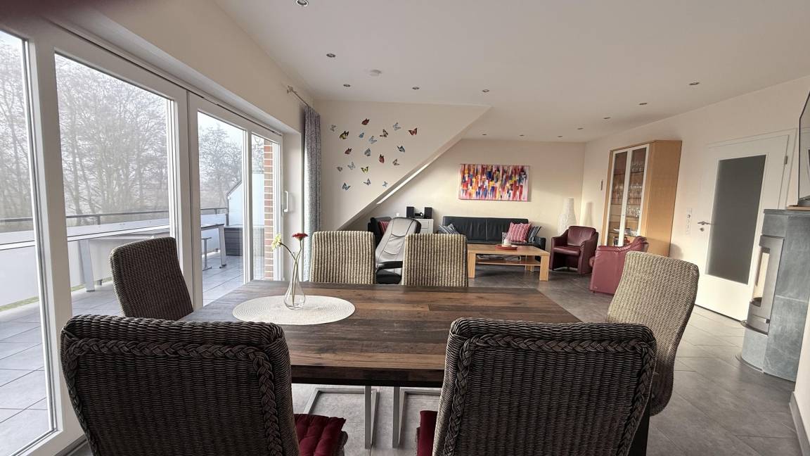 Die luxuriöse Ferienwohnung bietet auf ca. 140 m² ausreichend Platz für 2 bis 6 Personen und ist mit 5 Sternen vom Deutschen Tourismusverband ausgezeichnet. Sie verfügt über drei Schlafzimmer, die mit großen Doppelbetten, LED-TV und Kabelanschluss ausgestattet sind. Der großzügige Wohn- und Essbereich überzeugt durch einen Kaminofen und Unterhaltungsmöglichkeiten wie einen großen LED-TV mit Blue-Ray-Player. Die offene Küche ist modern eingerichtet mit Mikrowelle, Backofen, Ceran-Kochfeld, Kühlschrank mit Gefrierfach, Geschirrspüler und Kaffeemaschine. Die Wohnung erstreckt sich über zwei Etagen und beinhaltet drei Bäder, jedes mit Dusche, WC und Waschbecken. Ein Abstellraum mit Waschmaschine, Trockner und Bügeleisen ist ebenfalls vorhanden. Für Familien stehen ein Kinderbett und Hochstuhl bereit. WLAN ist in der gesamten Wohnung kostenfrei nutzbar. Haustiere sind nicht erlaubt, und es gilt ein Rauchverbot.