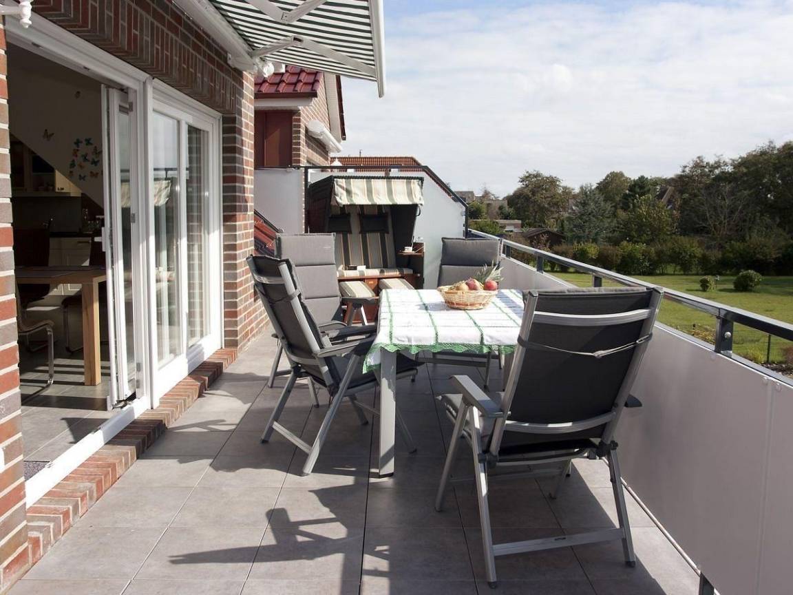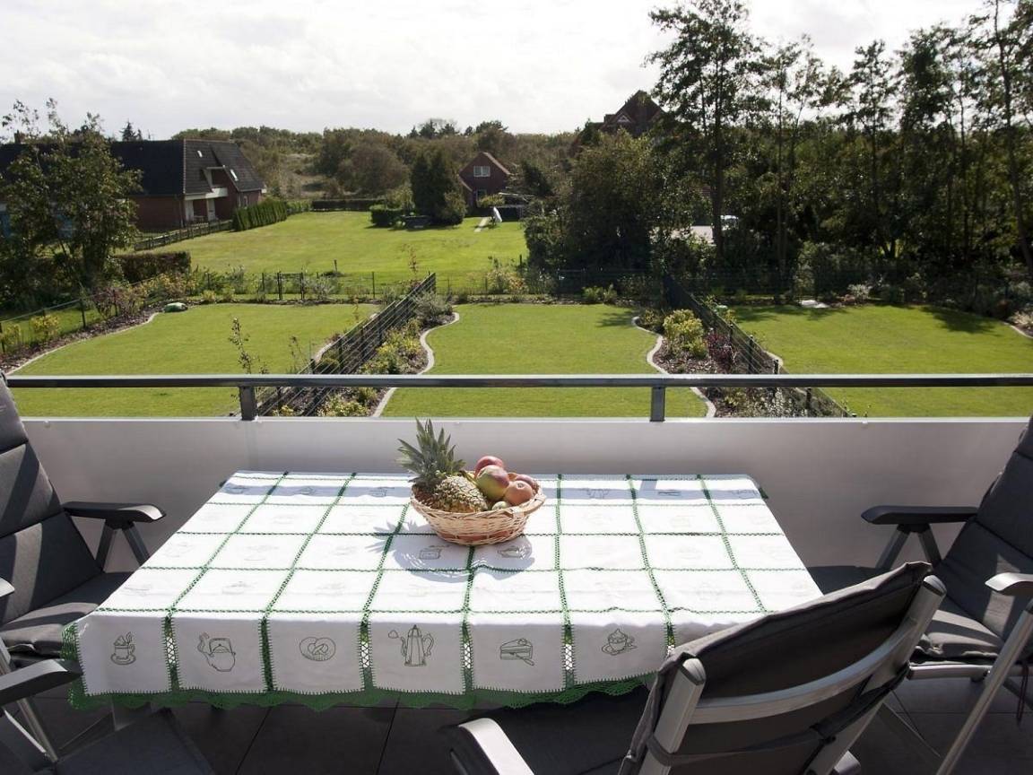 Die luxuriöse Ferienwohnung aus dem Jahr 2011 bietet einen großzügigen Außenbereich, der über die gesamte Breite der Wohnung einen 25 m² großen Balkon in sonniger Südlage umfasst. Von hier aus genießen Gäste einen herrlichen Ausblick über Gärten und Dünen. Der Balkon ist mit einer Markise ausgestattet, die Schatten spendet, sowie einem hochwertigen Strandkorb, der zum Entspannen einlädt. Ein Tisch für sechs Personen und ein E-Grill stehen ebenfalls zur Verfügung, ideal für gesellige Abende im Freien. Haustiere sind nicht erlaubt, und in der gesamten Wohnung gilt ein Rauchverbot. Der Außenbereich ist somit eine perfekte Ergänzung zur stilvollen Ferienwohnung mit erstklassiger Ausstattung, die für bis zu sechs Personen geeignet ist.