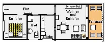 Im Wohnbereich stehen Ihnen ein TV Gerät für gemütliche Filmabende parat, sowie ein Radio und ein Kassettenrekorder. W-Lan ist natürlich auch vorhanden. Hier finden Sie für zwei weitere Personen zwei ausklappbare Schrankbetten, die sich leicht am Abend umfunktionieren lassen.