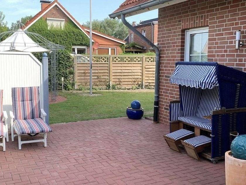 GroßeTerrasse und Liegewiese mit Strandkorb, Gartenmöbel und Sonnenliegen mit Auflagen, Pavillon mit Zeltdach.