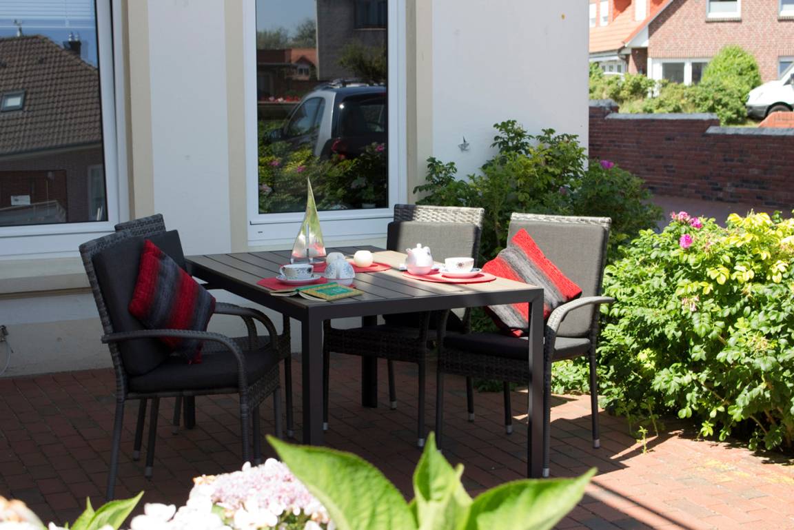 Die rund 78 m² große Ferienwohnung befindet sich im Erdgeschoss der denkmalgeschützten "Villa Emilie". Freuen Sie sich auf einen erholsamen Urlaub mit Ihrer gesamten Familie. Auf der Süd-Terrasse hier können Sie Ihren Tag ausklingen lassen.