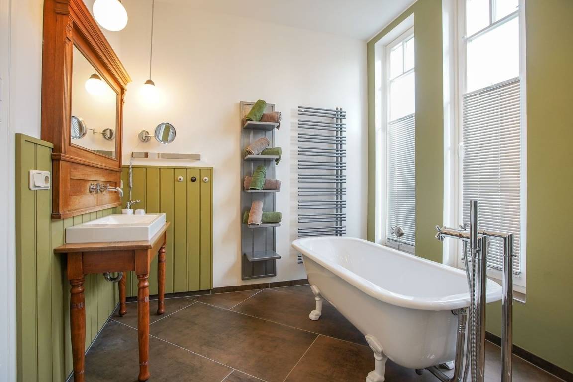 Das geräumige und gut gestaltete Badezimmer setzt die stimmige Innenarchitektur fort. Eine freistehende Wanne und eine Panorama-Dusche sorgen für Wohlfühlatmosphäre auch an grauen Tagen, was die im Haus befindliche Gemeinschaftssauna noch abrundet.