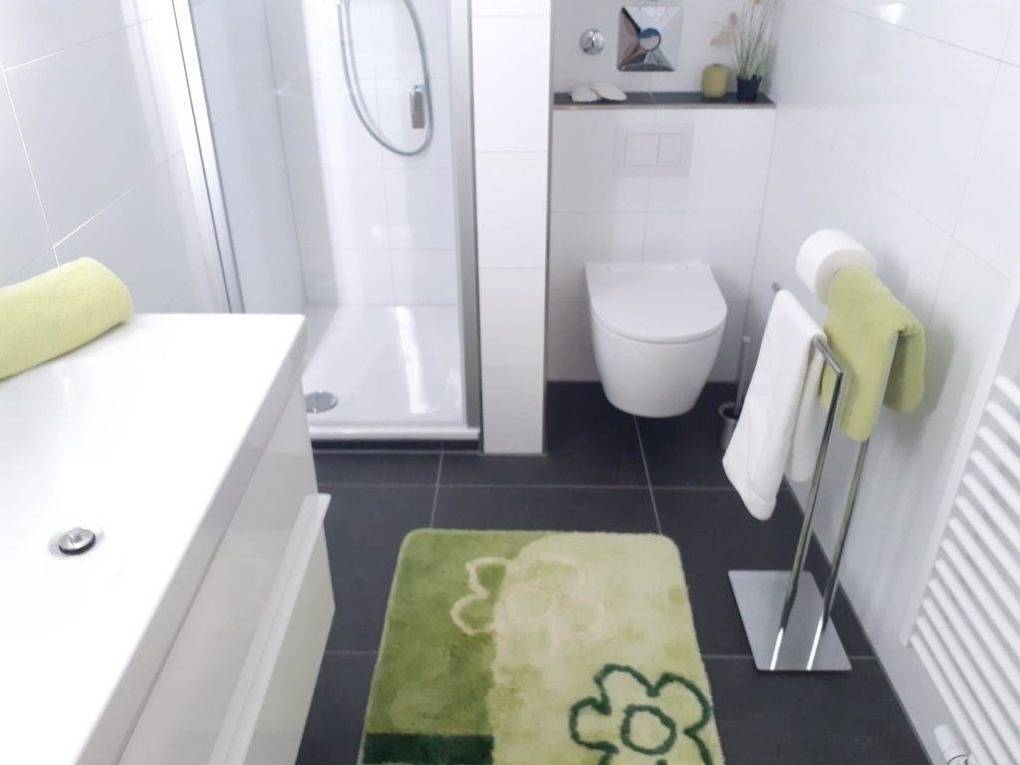 Das Badezimmer ist mit Dusche und WC ausgestattet.