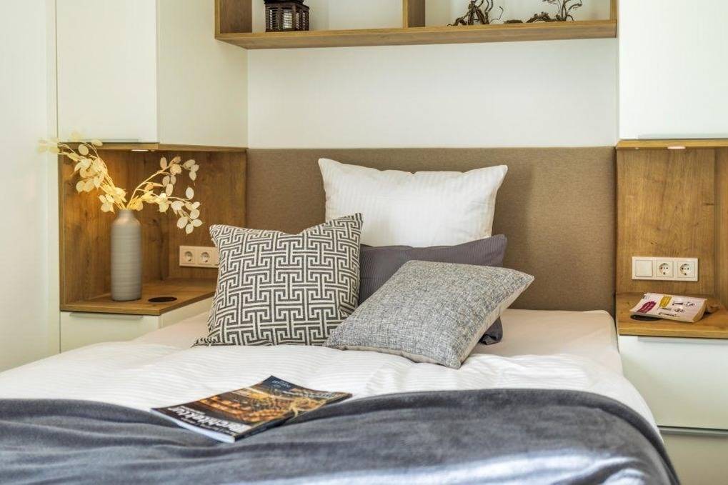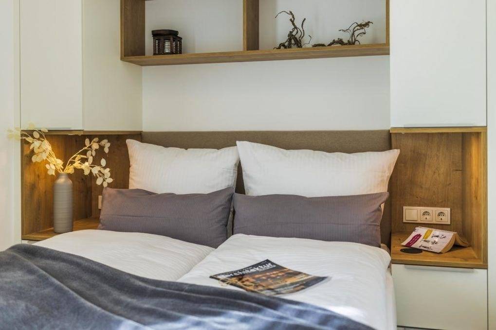 Die Ferienwohnung bietet eine komfortable Gestaltung, die ideale Voraussetzungen für einen erholsamen Aufenthalt schafft. Sie verfügt über ein helles Schlafzimmer mit zwei Doppelbetten, die ausreichend Platz für bis zu vier Personen bieten. Die modern ausgestattete Küchenzeile lädt mit einem Elektro-/Gasherd, Backofen, Mikrowelle und Geschirrspüler zum Kochen ein. Geschirr und Besteck sind ebenfalls vorhanden, wodurch die Selbstverpflegung unkompliziert möglich ist.