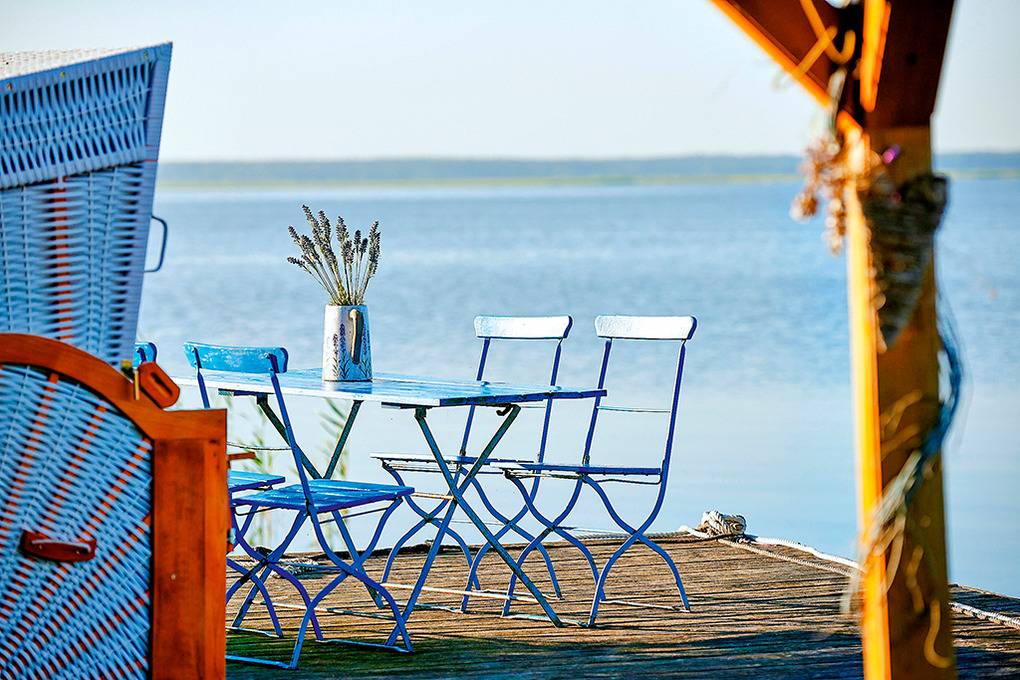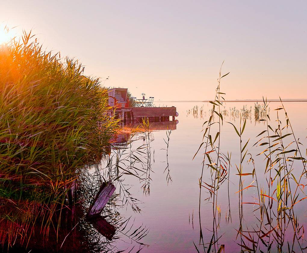 Ort: Born. Idyllische, ruhige Lage unmittelbar am malerischen Bodden. Eigener Bootsanlegeplatz mit Slip/-Traileranlage nur 50 m! Hafen 500 m. Ortsmitte 300 m. Ostseestrand Prerow, Ahrenshoop jeweils 9 km.