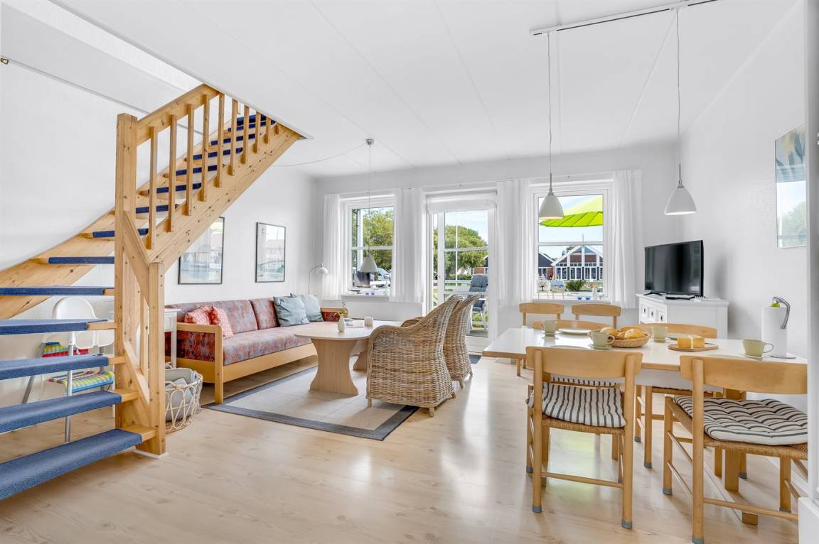 Die Ferienwohnung liegt im Erdgeschoss und ist mit einer Diele, einem schönen Badezimmer, einer Küche mit u. a. Geschirrspüler, einem Wohnzimmer mit Essecke sowie einer Sofaecke und TV eingerichtet. Vom Wohnzimmer aus gelangst du auf die schöne Terrasse. Im Obergeschoss findest du zwei Schlafzimmer.