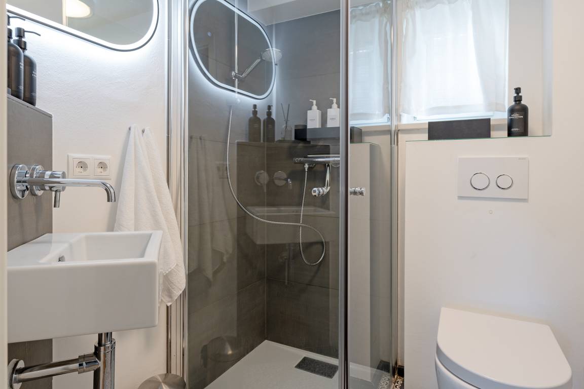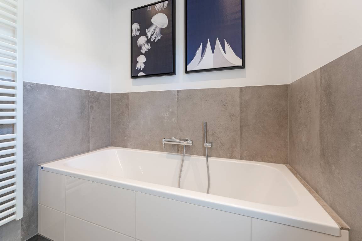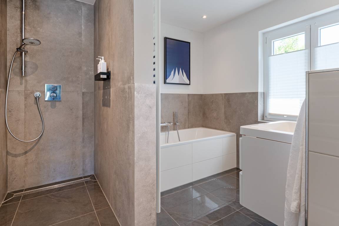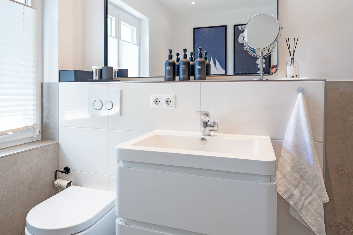 Zwei moderne Badezimmer verfügen über bodengleiche Duschen, eine Badewanne, Waschbecken und WC. Zusätzlich stehen ein Haartrockner sowie eine Waschmaschine und ein Trockner zur Verfügung. Eine Sauna zur Eigennutzung verspricht erholsame Stunden.