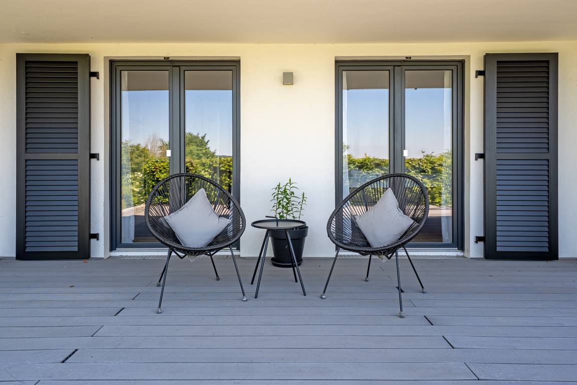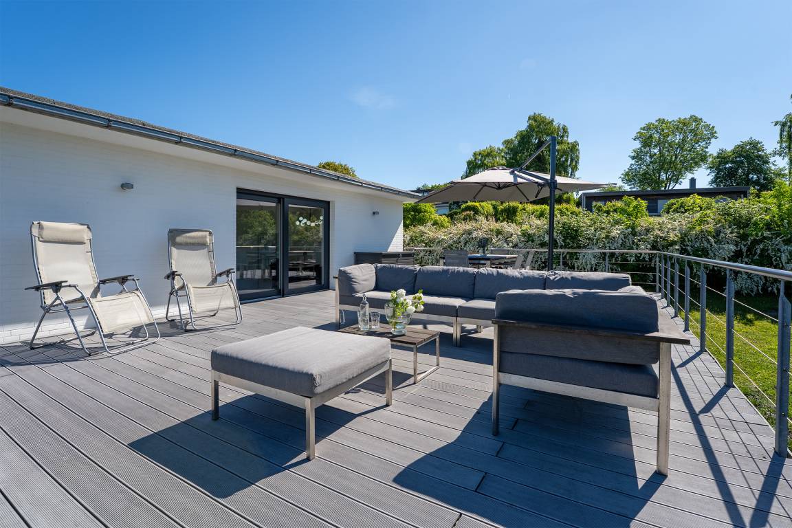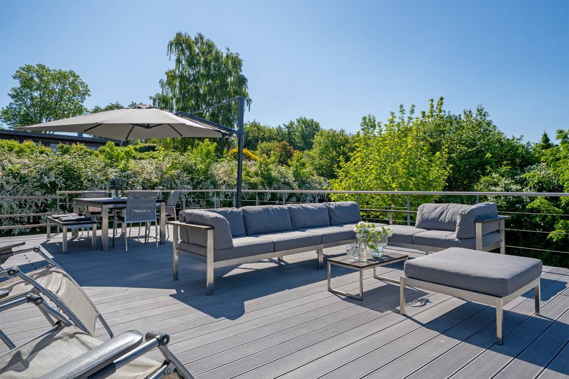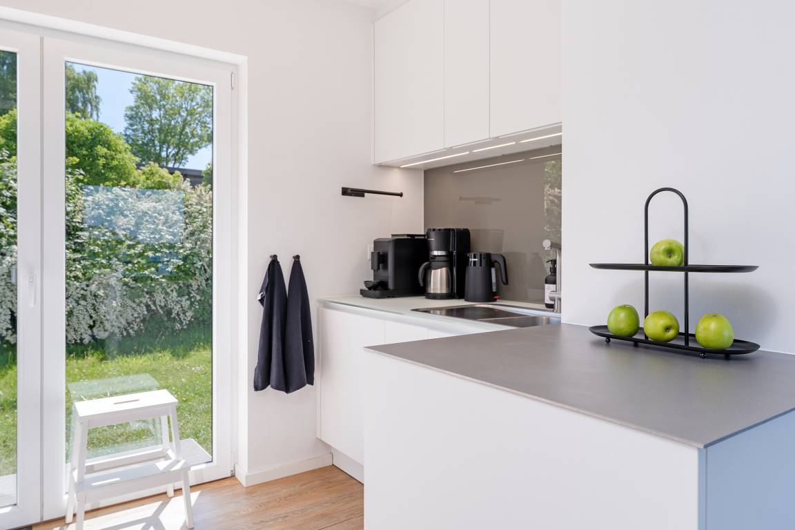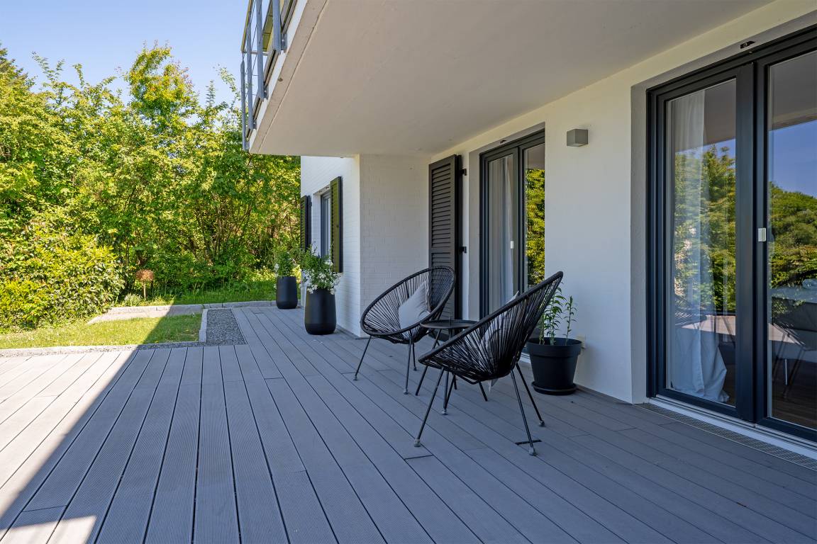 Der stilvolle Wohnbereich lädt mit einer gemütlichen Sofaecke, einem TV und großen Fenstern zum Verweilen ein. Die angrenzenden Terrassen und der Balkon mit Gartenmöbeln bietet Platz für entspannte Stunden im Grünen. Ein eingezäunter Garten sorgt für Privatsphäre.