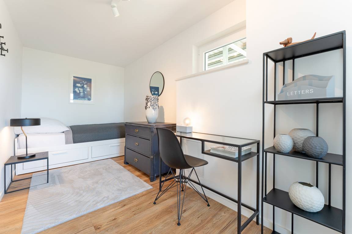 Schlafzimmer 4 (EG): 1 Einzelbett (80x200 cm), Kommode, Verdunkelung: Gardinen und Fensterläden (außen), Platz für ein Babybett vorhanden