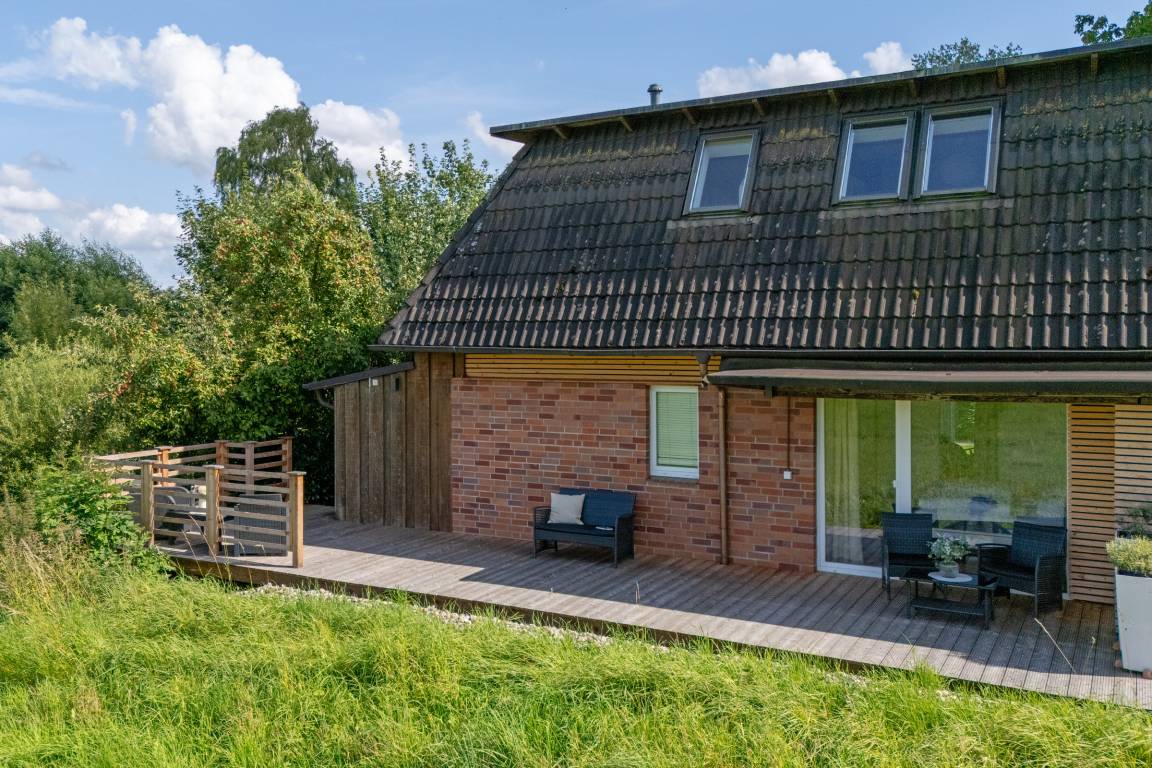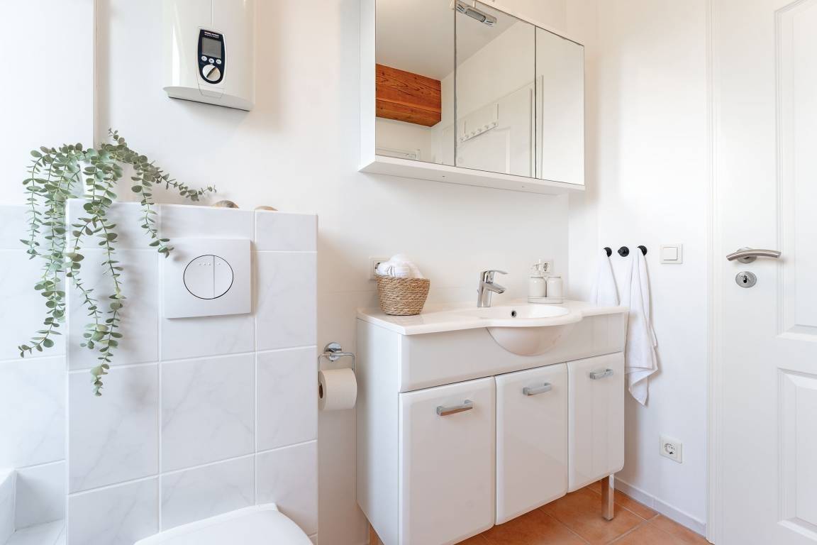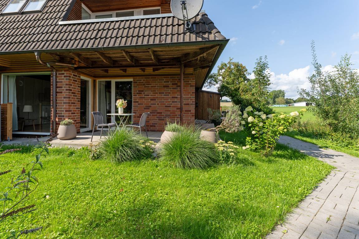 Diese großzügige Ferienwohnung besticht durch ihre moderne Ausstattung und die idyllische Lage in der Holsteinischen Schweiz. Sie ist perfekt für eine erholsame Auszeit geeignet. Das helle und stilvoll eingerichtete Wohnzimmer lädt mit einer gemütlichen Sofaecke und einem TV zum Entspannen ein. Von hier aus gelangen Sie auf den überdachten Balkon mit Südausrichtung, der mit Gartenmöbeln ausgestattet ist – ideal für ein Frühstück im Freien oder einen gemütlichen Abend. Die moderne, offene Küche ist mit einem Cerankochfeld, Backofen, Kühlschrank mit Gefrierfach und einer Nespresso-Maschine hervorragend ausgestattet. Der edle Essbereich am Fenster bietet Platz für gesellige Mahlzeiten und gemeinsame Stunden. Das Schlafzimmer ist komfortabel eingerichtet und bietet ruhige Nächte für 2 Personen im Doppelbett (180x200 cm). Das moderne Badezimmer ist mit einer Wanne mit Duschfunktion sowie Fußbodenheizung ausgestattet.