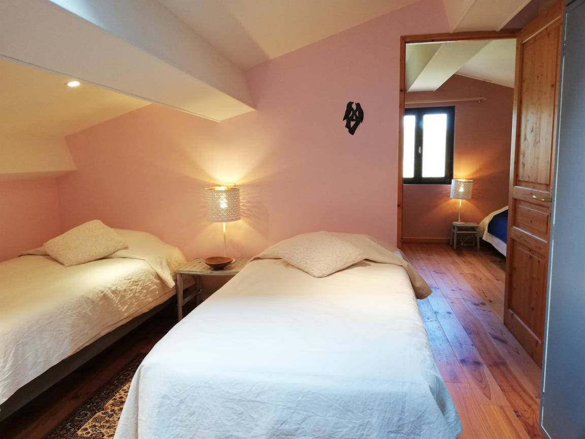 _Ein Schlafzimmer mit zwei 90 cm breiten Einzelbetten und angrenzendem Badezimmer und WC.