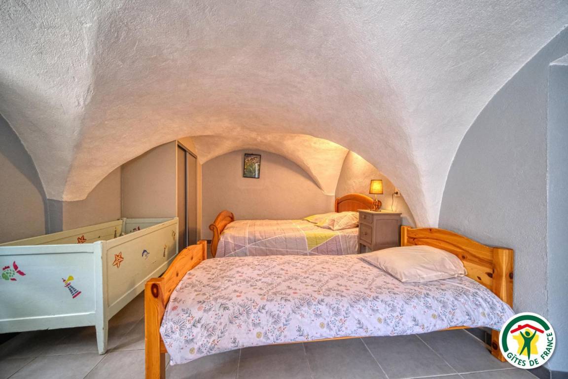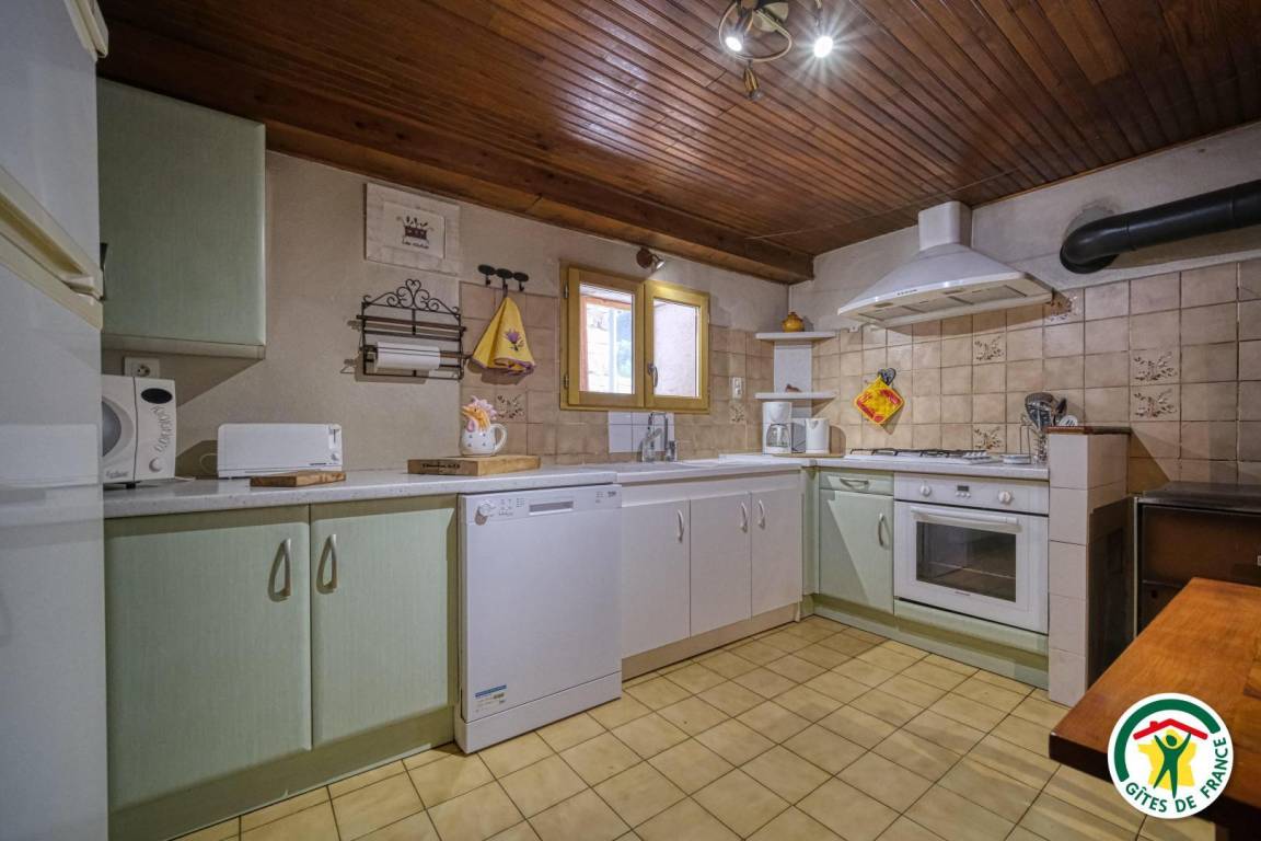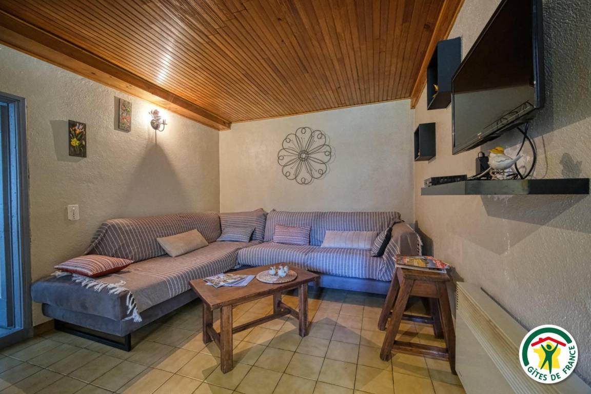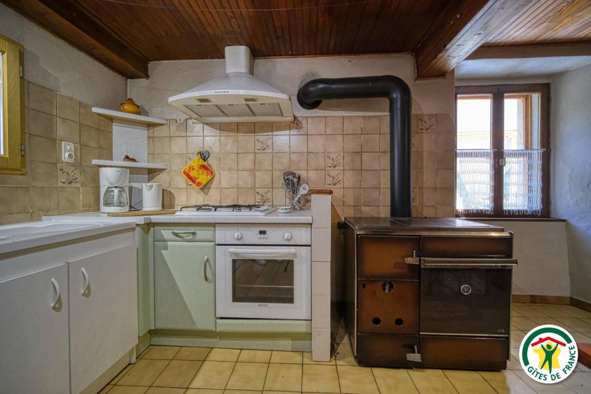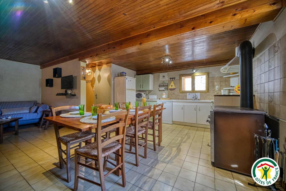 Hochparterre: Einbauküche, zum Esszimmer mit Holzofen hin offen, Wohnzimmer mit Flachbildfernseher, mit Zugang zu einer Terrasse. Badezimmer mit Badewanne, separates WC. 2 Schlafzimmer (1 Bett 140 cm, 2 Betten 90 cm) (1 Bett 140 cm, 1 Bett 90 cm), eines davon zur Terrasse hin ausgerichtet. Zufahrt zur Unterkunft über eine 300 m lange, nicht asphaltierte Straße. Die Ferienunterkunft liegt auf 870 m Höhe.