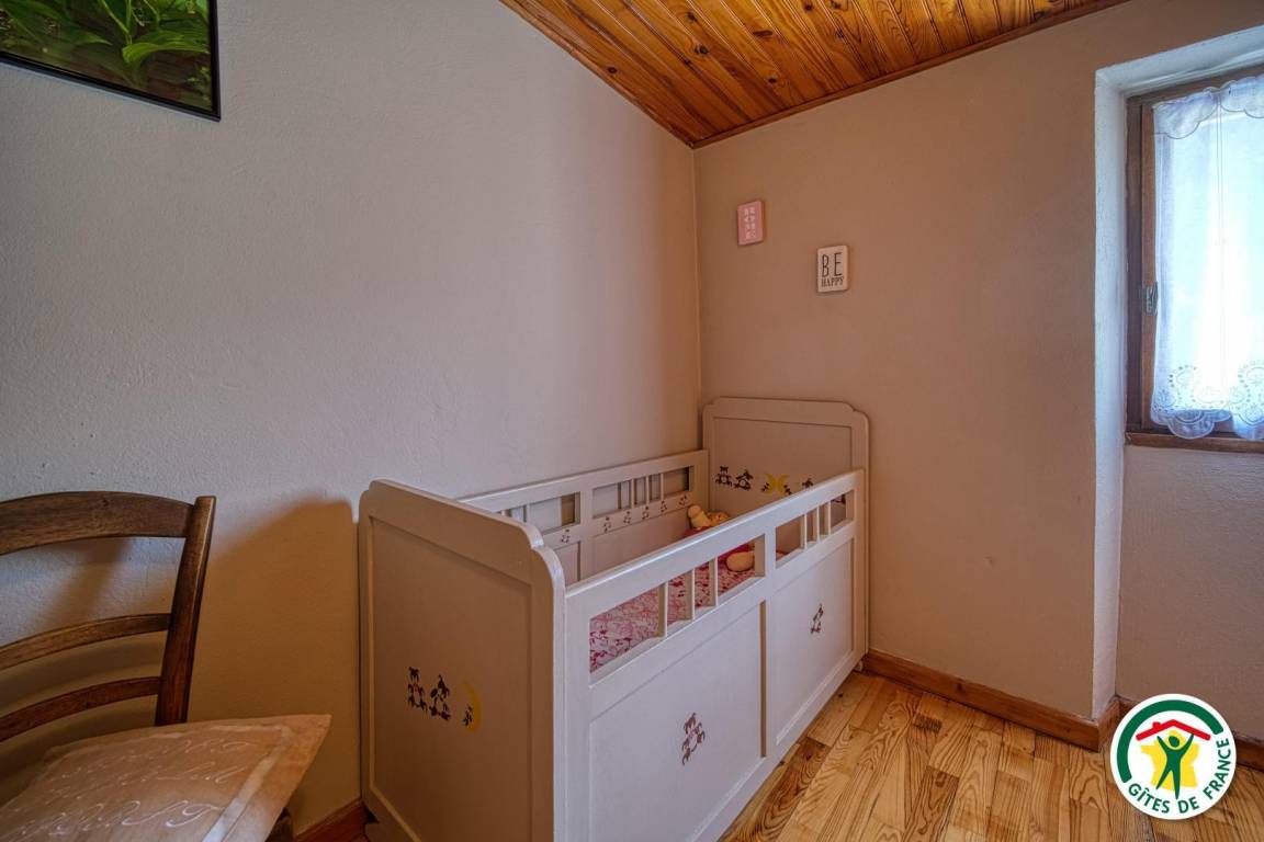 Erdgeschoss: Esszimmer mit Küche und Wohnzimmerecke mit Fernseher, Zugang zur Terrasse. Holzofenheizung. Bad mit Badewanne, separates WC. Obergeschoss: 2 Schlafzimmer (1 Bett 140 cm) (1 Bett 140 cm, 1 Babybett). Holzofenheizung. Die Unterkunft liegt auf 810 m Höhe.