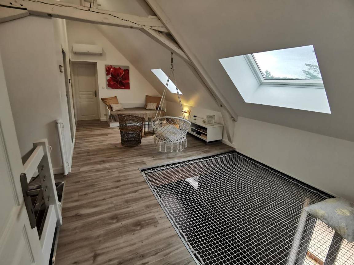 Entdecken Sie im Obergeschoss ein Ruhenetz, ideal für ein Nickerchen, egal wie alt Sie sind. Das Schlafzimmer (1 Bett 140 x 190 cm) kann über eine Tür einen eigenen Zugang haben. Das Badezimmer im Obergeschoss... Zwei weitere Personen können im Ausziehbett im Zwischengeschoss untergebracht werden.