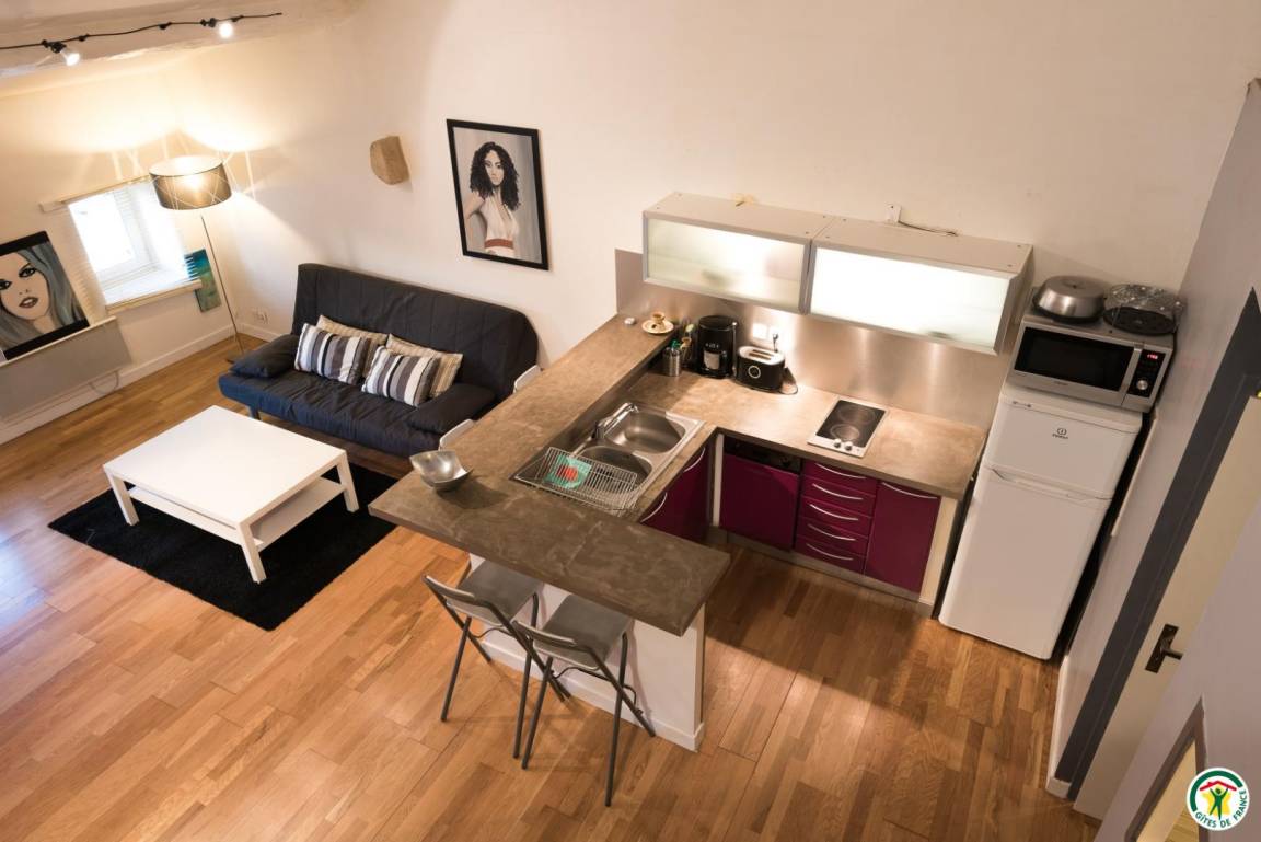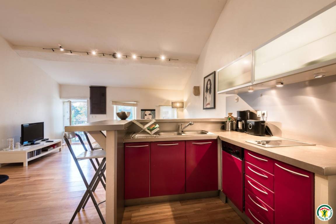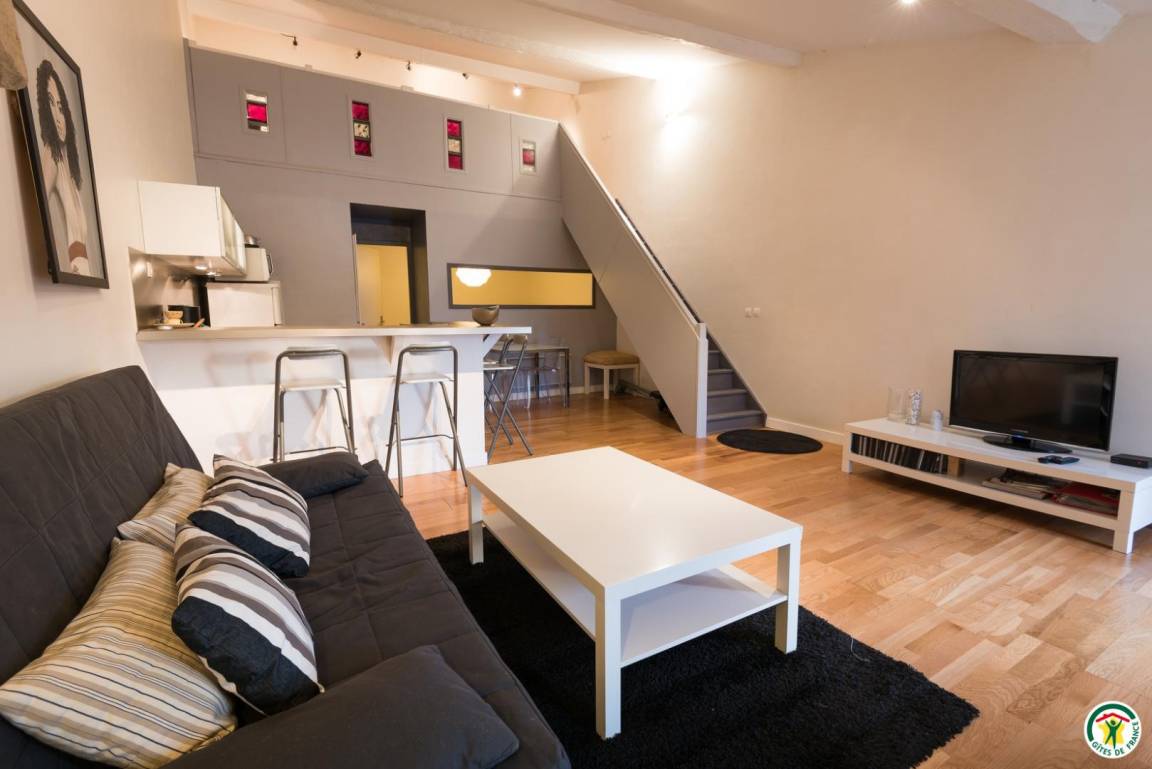 Ferienwohnung im 1. Stock, in einem Flügel des Gebäudes des Vermieters. 1. Stock: Küchenzeile, zum Wohnzimmer (Schlafsofa) hin offen, Bad (Dusche)/WC, Arbeitszimmer (Schlafsofa). 2. Stock: Zwischengeschoss (1 Bett 140 cm).