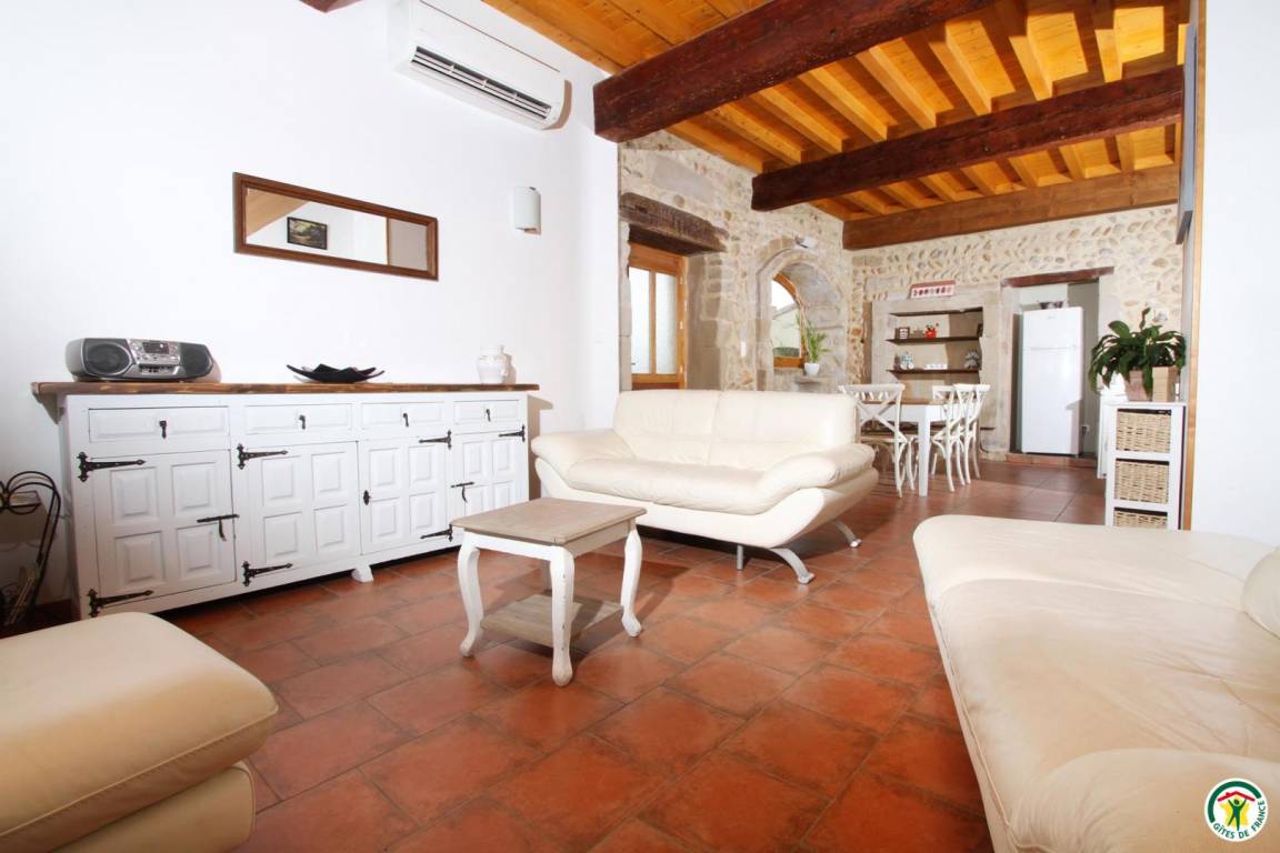 Erdgeschoss: Küchenzeile, zum Aufenthaltsbereich und Wohnzimmer hin offen. WC mit Handwaschbecken. 1. Stock: 2 klimatisierte Schlafzimmer (1 Bett 160 cm) (2 Betten 90 cm), Badezimmer, WC. 2. Stock: klimatisiertes Schlafzimmer (4 Betten 90 cm) im Zwischengeschoss mit Bad (Dusche) und WC.