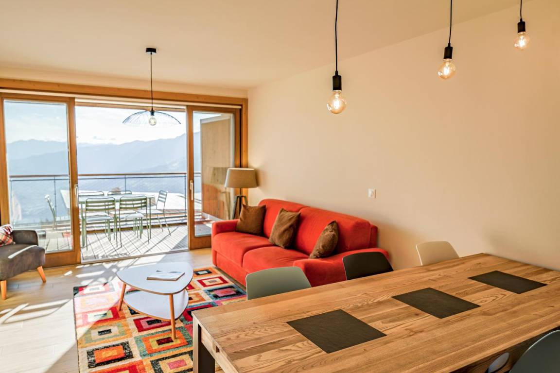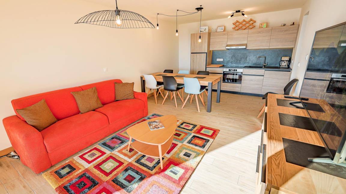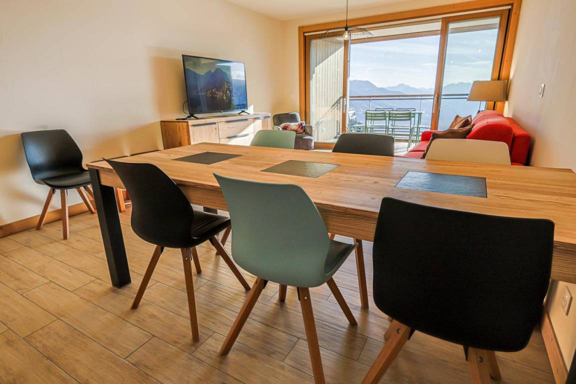 Fläche von ungefähr 75 m². Orientierung : Süd-Ost, Süd-West. Diele. Wohnzimmer. Schlafzimmer mit Doppelbett (180x200). Schlafzimmer mit 2 Einzelbetten (90x200). offener Schlafbereich mit 2 Stockbetten. Küche mit Raclettegerät, Backofen, Toaster, Mikrowellenherd, Induktionsherdplatten, Kühlschrank, Kühl-Gefrier-Kombination. Badezimmer. Waschräume mit Dusche. WC. Terrasse mit Tisch. Die oberen Betten sind nicht für Kinder unter 6 Jahren geeignet.