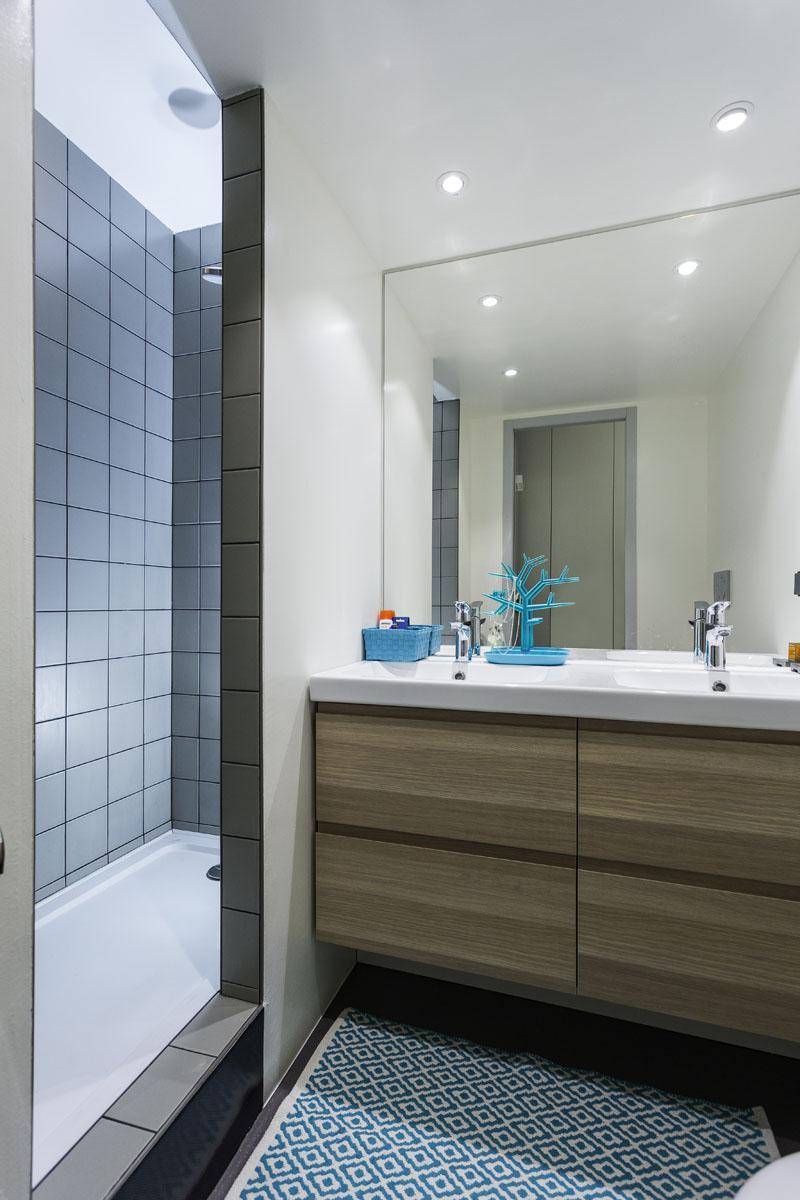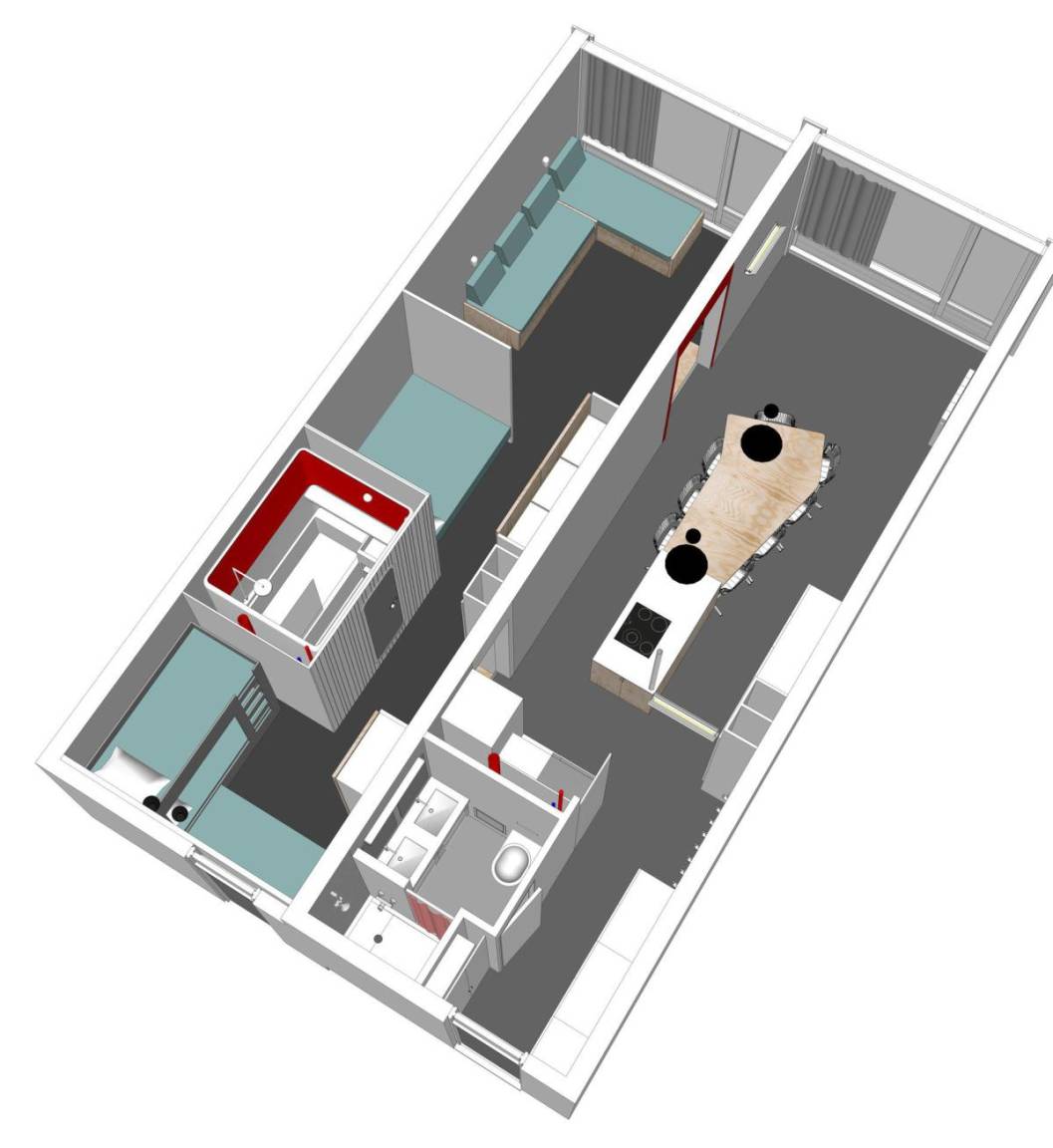Fläche von ungefähr 54 m². 15te Etage. Orientierung : Süd. Wohnzimmer mit 2 Sofabetten (80). offener Schlafbereich mit Doppelbett (140). offener Schlafbereich mit Einzelbett (80), 2 Stockbetten (80). Kochnische mit Wasserkocher, Kaffeemaschine (filtre), Backofen, Toaster, Waschmaschine, Geschirrspülmaschine, Mikrowellenherd, 3 Induktionsherdplatten, Kühlschrank. Badezimmer mit Badewanne, WC. Waschräume mit Dusche, WC. Balkon. Die oberen Betten sind nicht für Kinder unter 6 Jahren geeignet.