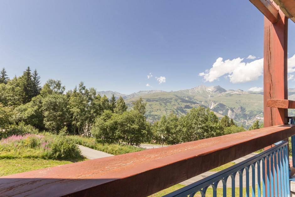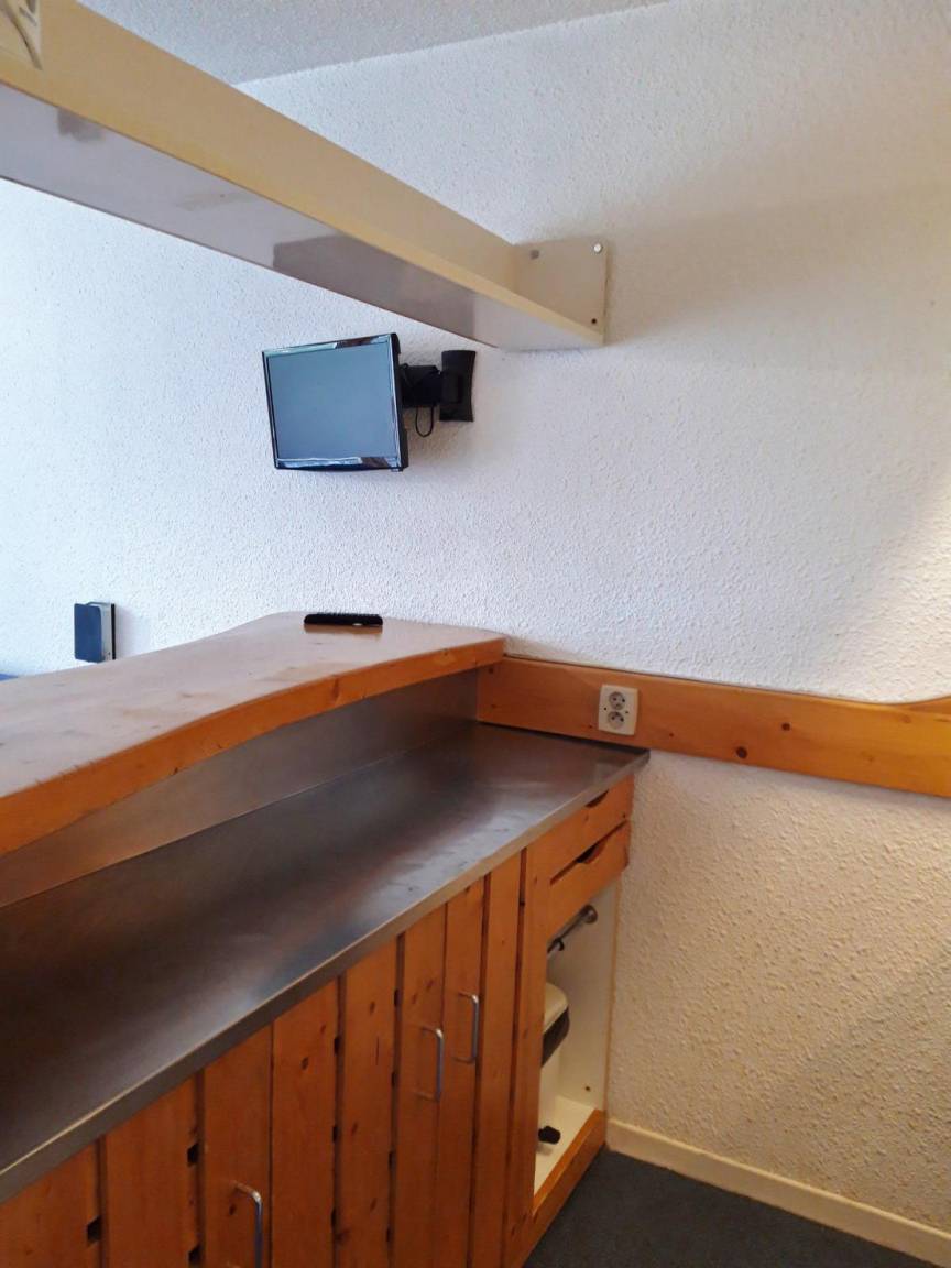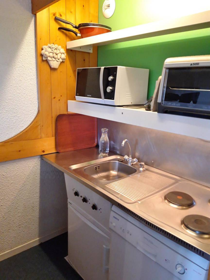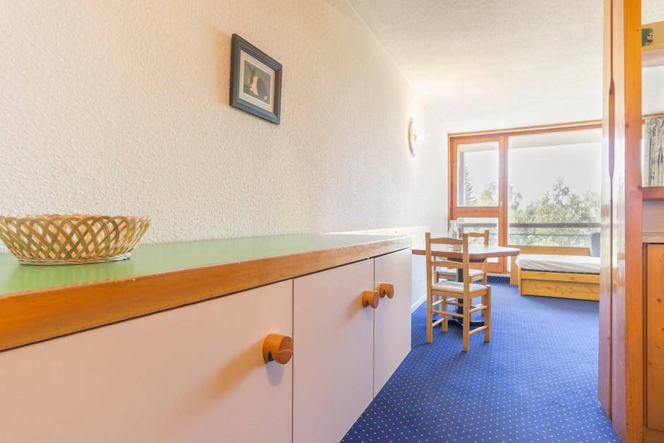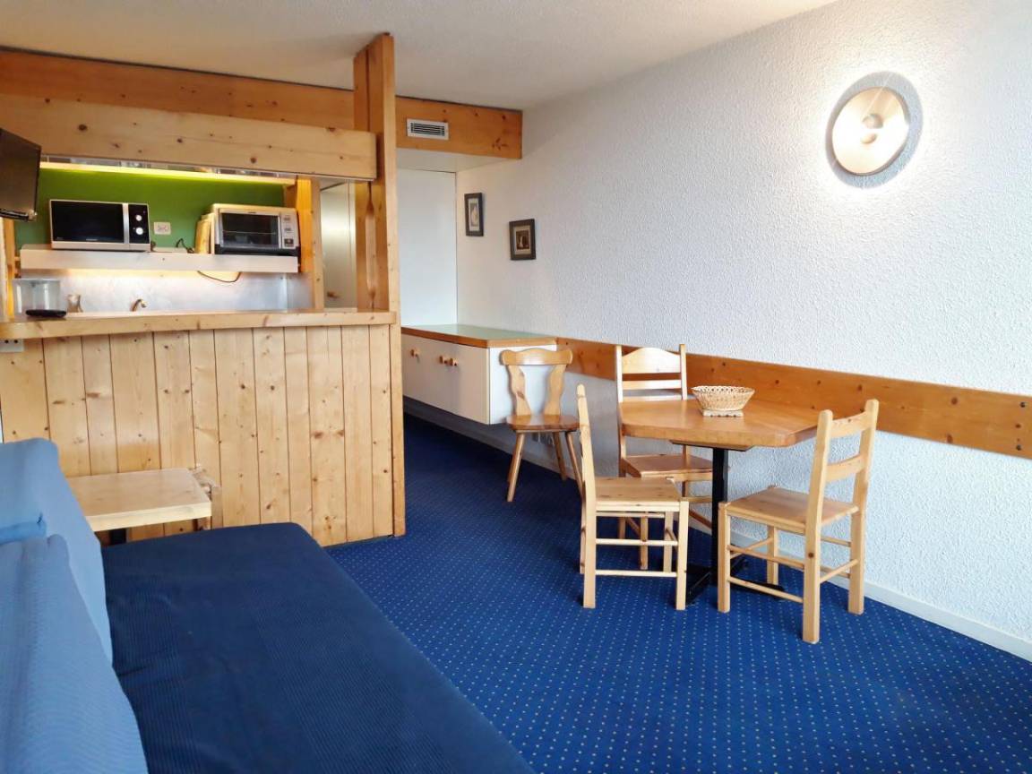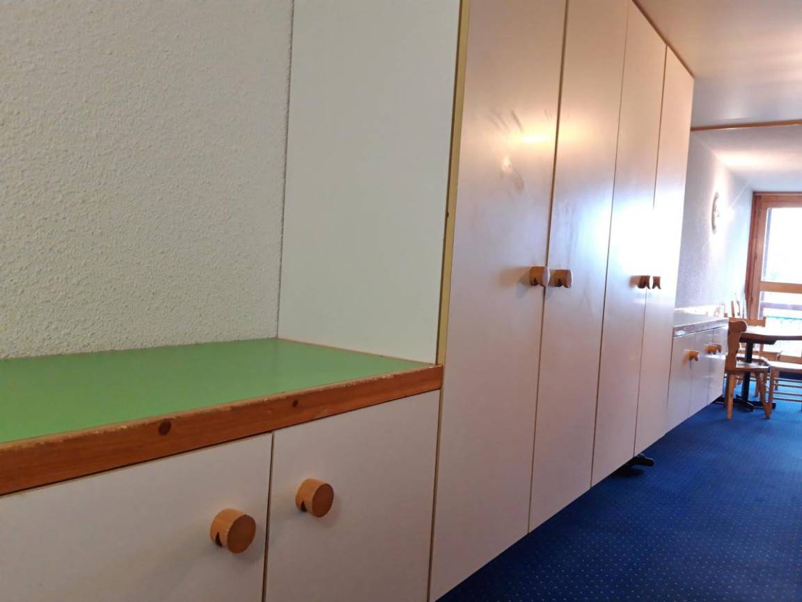 Fläche von ungefähr 28 m². 5te Etage. Orientierung : Süd, West. Blick tal. Wohnzimmer mit 2 Einzelbetten (80), TV. offener Schlafbereich mit 2 Stockbetten (80), Ausziehbett (80). Kochnische mit Wasserkocher, Kaffeemaschine (filtre), Geschirrspülmaschine, kleiner Backofen, 2 elektronische Herdplatten, Kühlschrank. Badezimmer mit WC. Balkon. Die oberen Betten sind nicht für Kinder unter 6 Jahren geeignet.