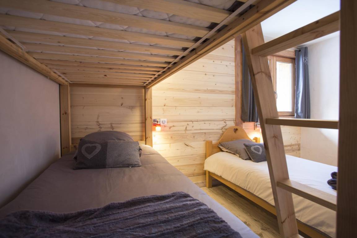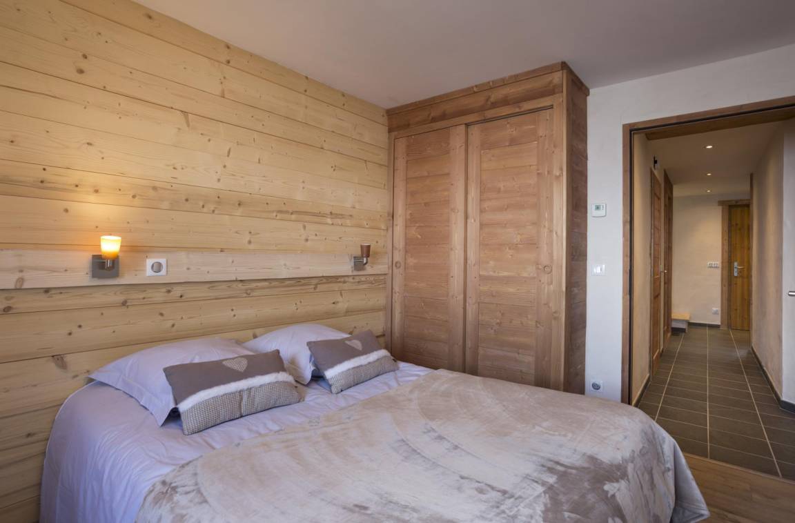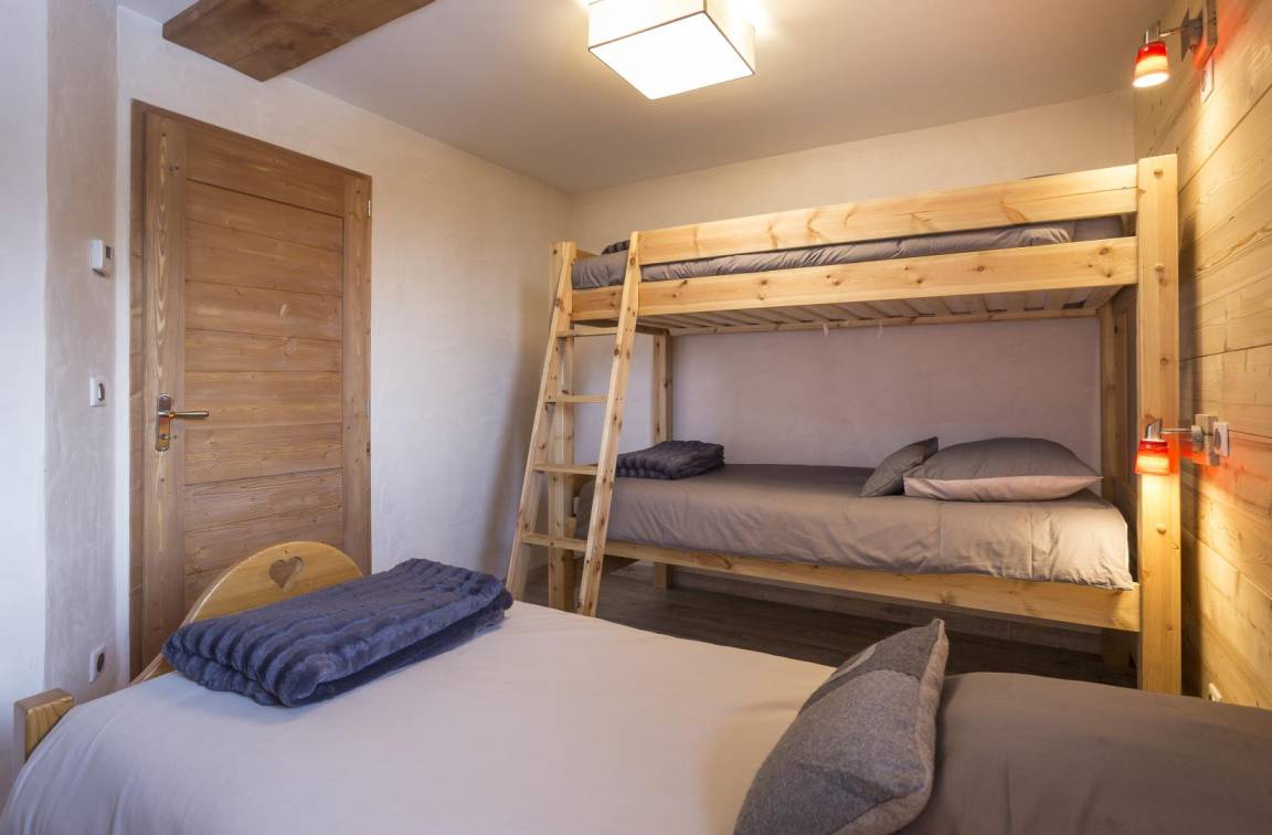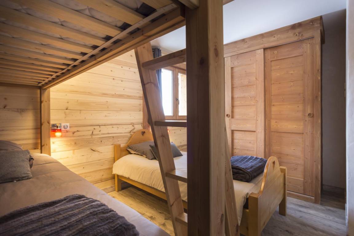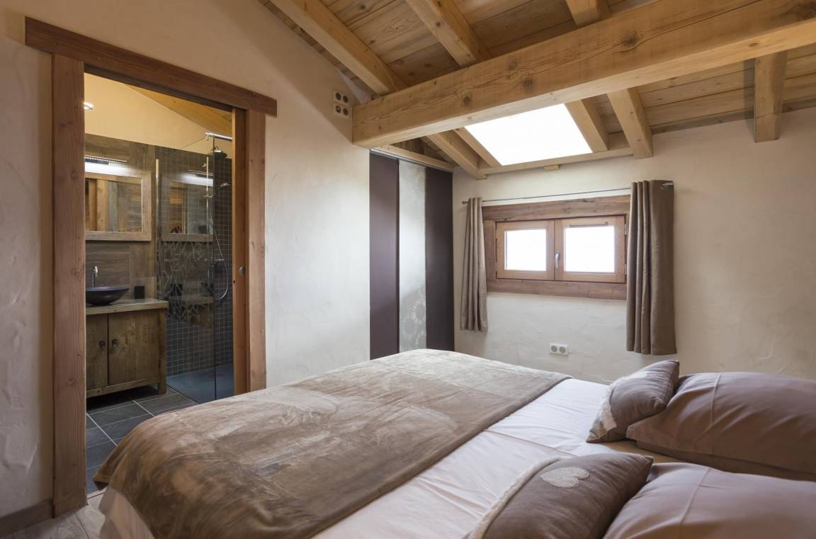 Im Chalet des Eigentümers (der im Erdgeschoss wohnt). Auf 2 Ebenen mit separatem Eingang. Parken auf dem öffentlichen Parkplatz am Weilereingang (60 m). Im 1. Stock (auf einer Ebene von der Zufahrtsstraße und dem Parkplatz): Eingang, 4-Sitzer-Sauna (mit Dusche), 4 Schlafzimmer (1 Doppelbett 160 x 200 cm mit Badezimmer (Dusche) / 1 Doppelbett 140 x 200 cm + 1 Einzelbett 90x200 cm / 3 Einzelbetten 90x200 cm davon 2 Etagenbetten / 3 Einzelbetten 90x200 cm davon 2 Etagenbetten), Badezimmer (Badewanne), 2 separate Toiletten. Im 2. Stock: Wohnküche mit Balkon, 1 Schlafzimmer mit Badezimmer (Dusche) (1 Doppelbett 160x200 cm), Waschküche, separates WC. Standseilbahn nach Les Arcs 1600 in 2 km Entfernung.