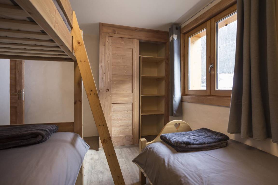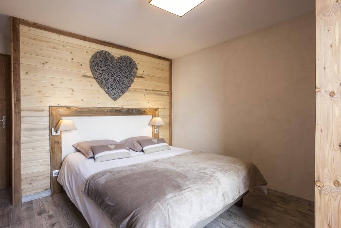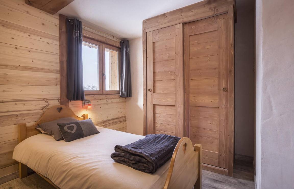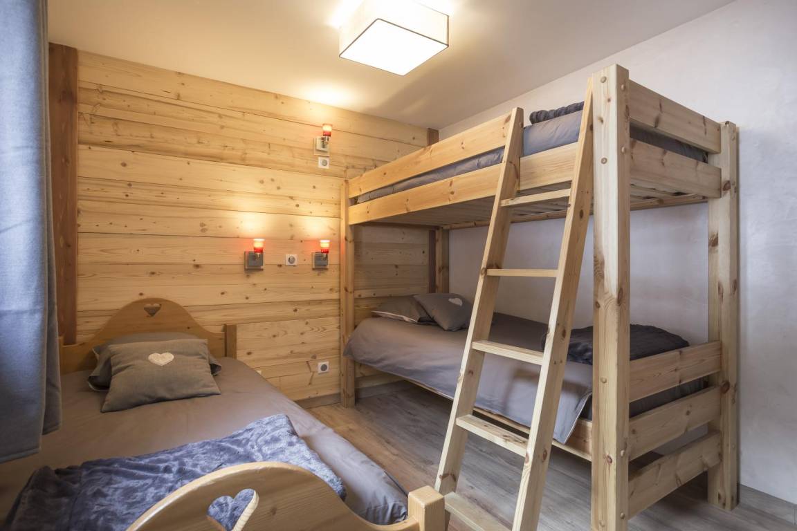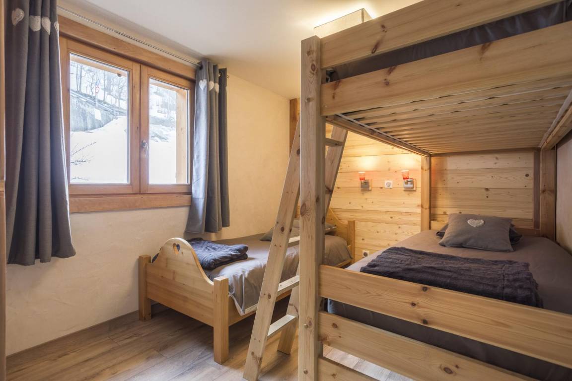 Im Chalet des Eigentümers (der im Erdgeschoss wohnt). Auf 2 Ebenen mit separatem Eingang. Parken auf dem öffentlichen Parkplatz am Weilereingang (60 m). Im 1. Stock (auf einer Ebene von der Zufahrtsstraße und dem Parkplatz): Eingang, 4-Sitzer-Sauna (mit Dusche), 4 Schlafzimmer (1 Doppelbett 160 x 200 cm mit Badezimmer (Dusche) / 1 Doppelbett 140 x 200 cm + 1 Einzelbett 90x200 cm / 3 Einzelbetten 90x200 cm davon 2 Etagenbetten / 3 Einzelbetten 90x200 cm davon 2 Etagenbetten), Badezimmer (Badewanne), 2 separate Toiletten. Im 2. Stock: Wohnküche mit Balkon, 1 Schlafzimmer mit Badezimmer (Dusche) (1 Doppelbett 160x200 cm), Waschküche, separates WC. Standseilbahn nach Les Arcs 1600 in 2 km Entfernung.
