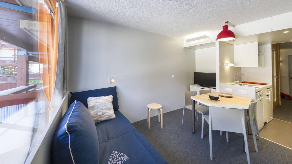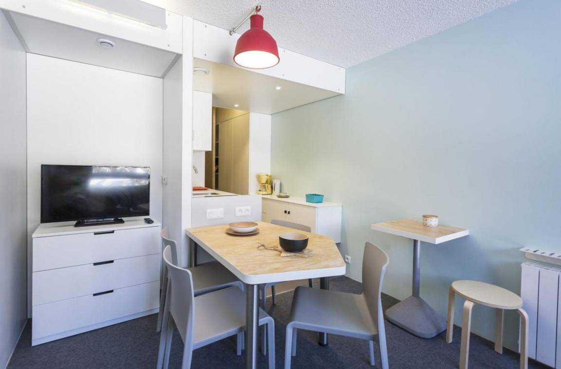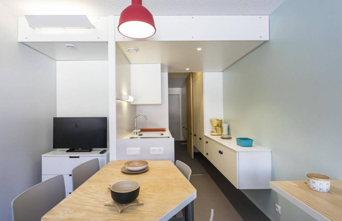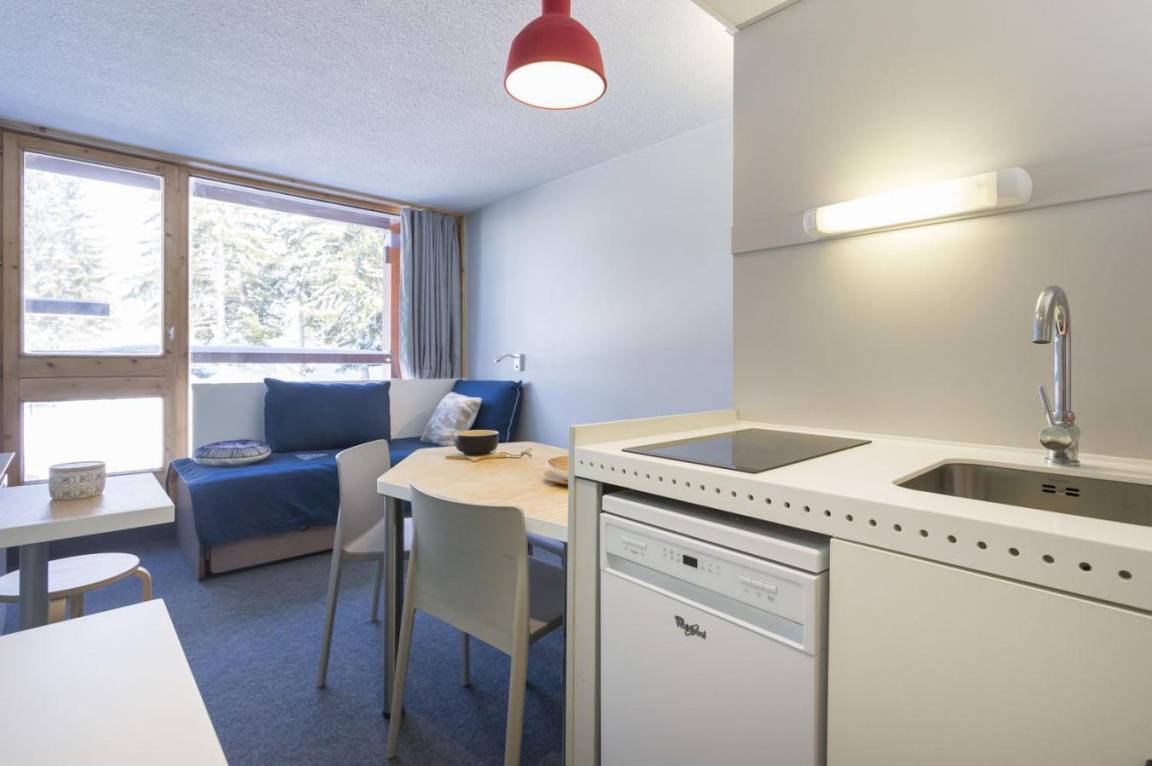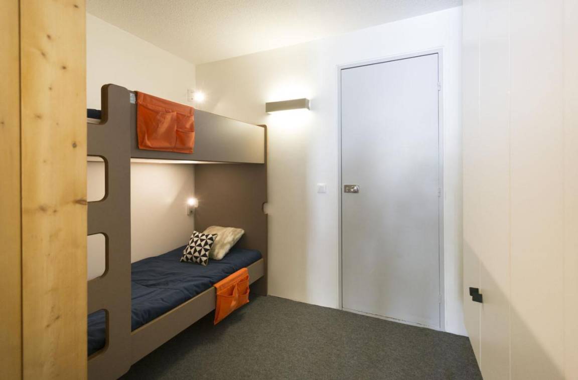 Fläche von ungefähr 25 m². 7te Etage. Orientierung : Nord, Ost. Wohnzimmer mit Ausziehschlafcouch für 2 Personen. offener Schlafbereich mit 2 Stockbetten (80). Kochnische mit Wasserkocher, Kaffeemaschine (filtres), kleiner Backofen mit Mikrowellenfunktion, Toaster, Geschirrspülmaschine, 2 Glaskeramikkochfelder, Kühlschrank. Badezimmer mit Badewanne, WC. Balkon. Die oberen Betten sind nicht für Kinder unter 6 Jahren geeignet.