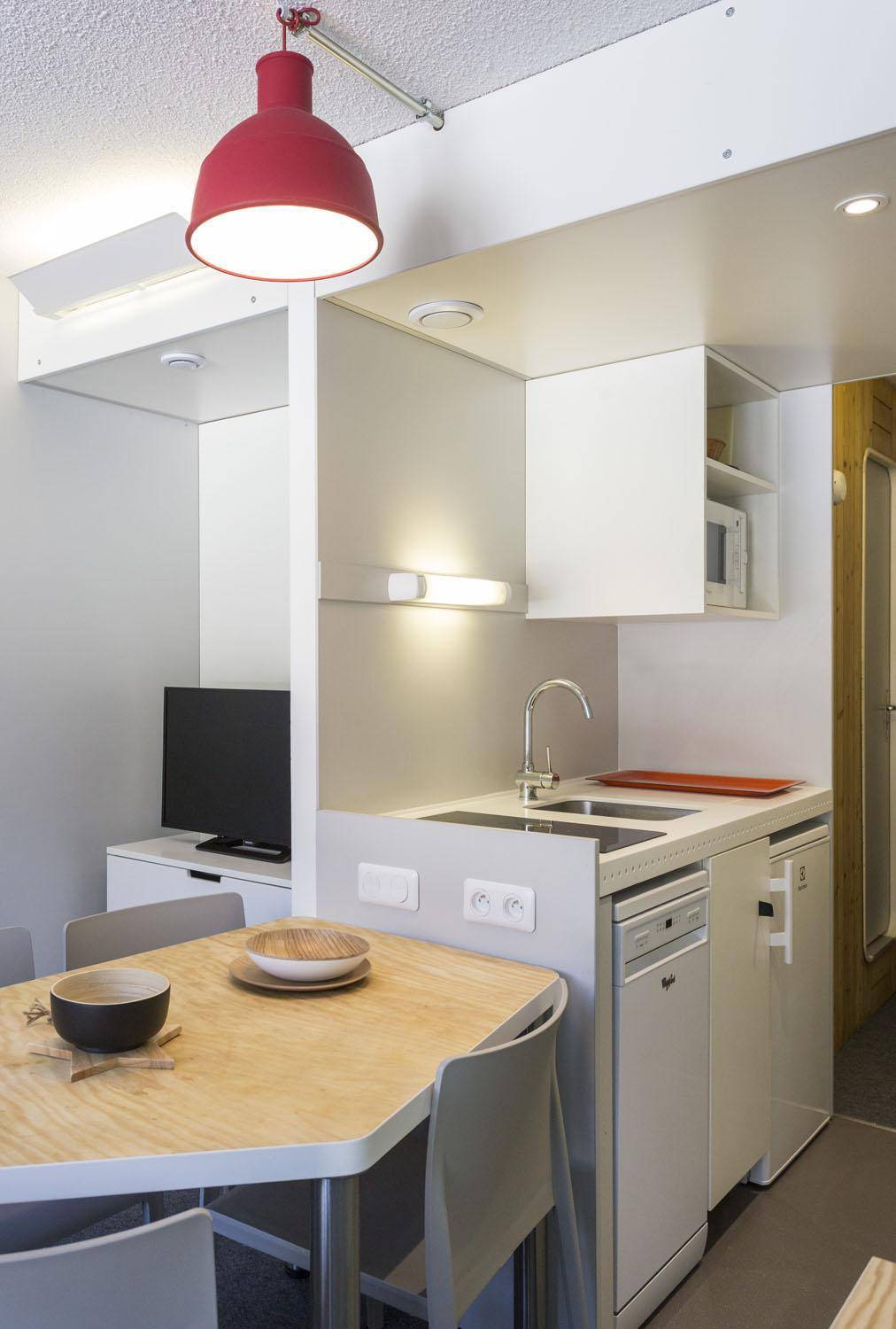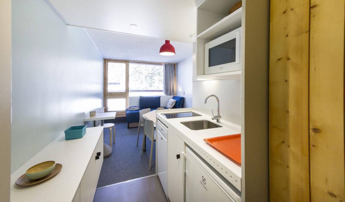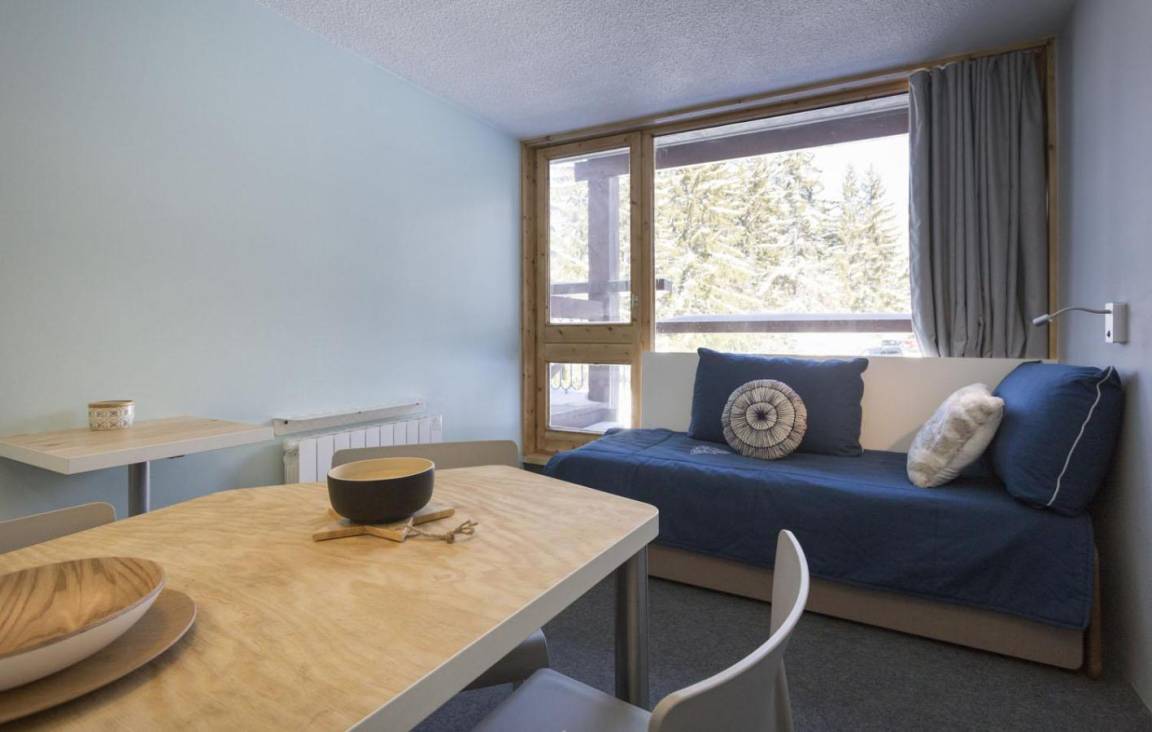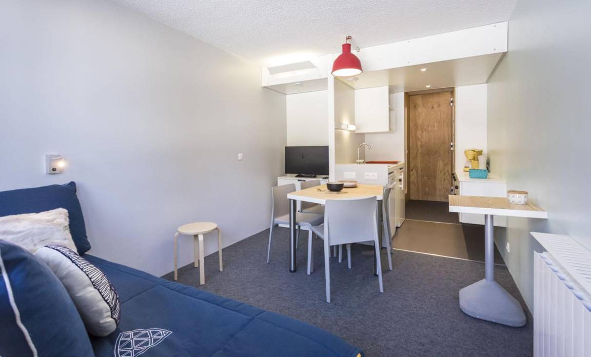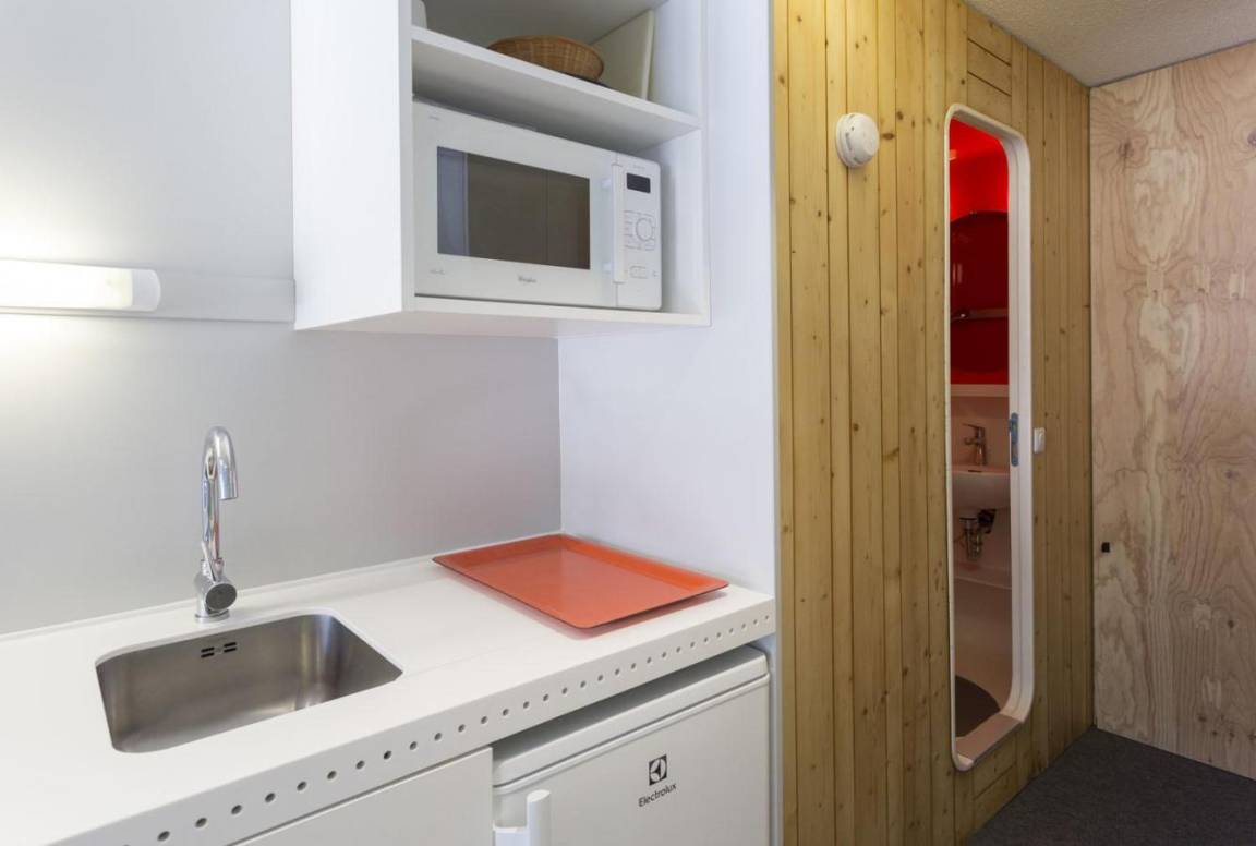 Fläche von ungefähr 25 m². 7te Etage. Orientierung : Nord, Ost. Wohnzimmer mit Ausziehschlafcouch für 2 Personen. offener Schlafbereich mit 2 Stockbetten (80). Kochnische mit Wasserkocher, Kaffeemaschine (filtres), kleiner Backofen mit Mikrowellenfunktion, Toaster, Geschirrspülmaschine, 2 Glaskeramikkochfelder, Kühlschrank. Badezimmer mit Badewanne, WC. Balkon. Die oberen Betten sind nicht für Kinder unter 6 Jahren geeignet.