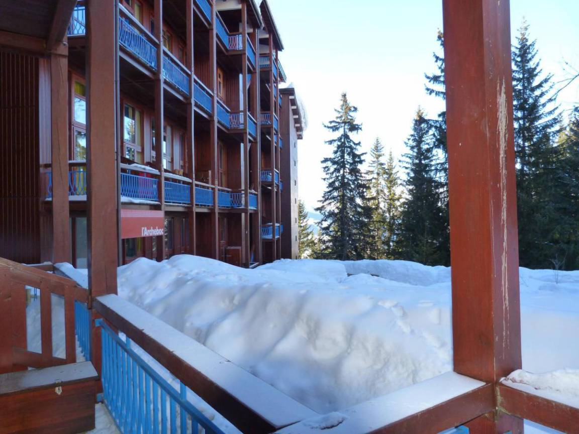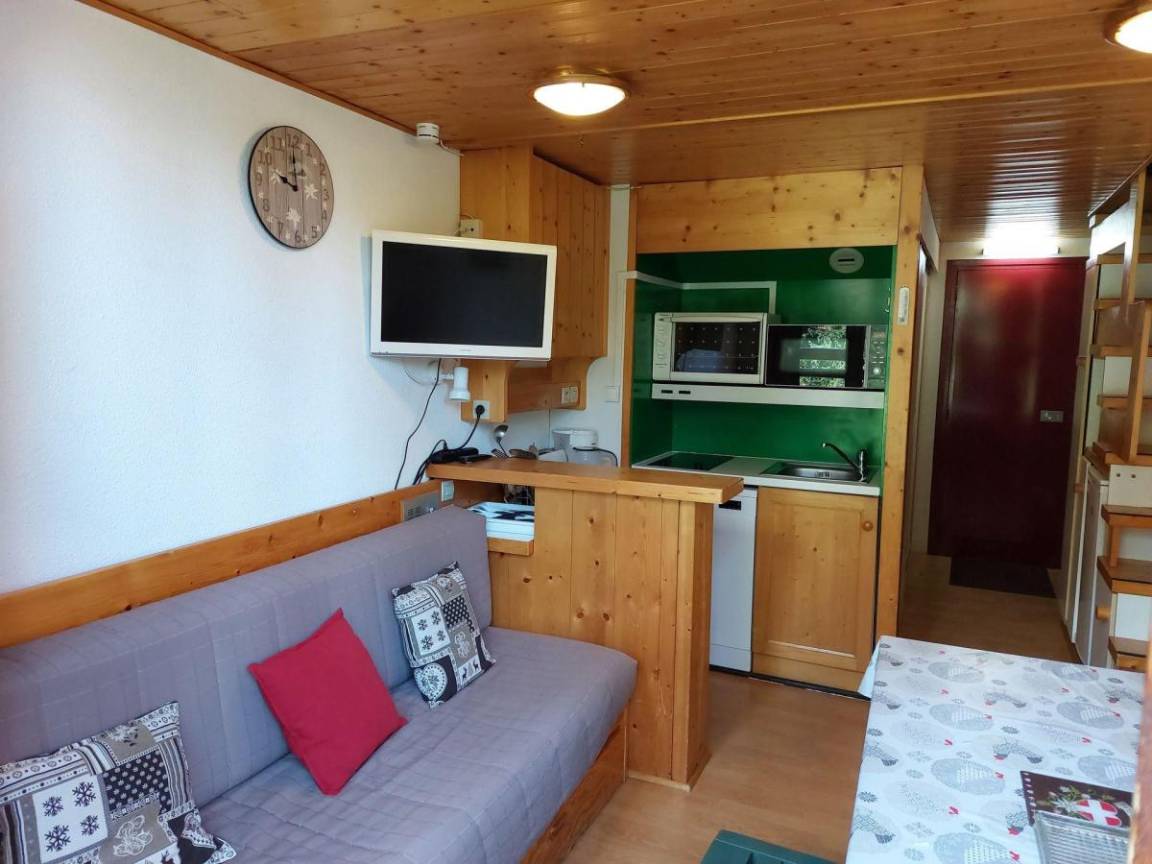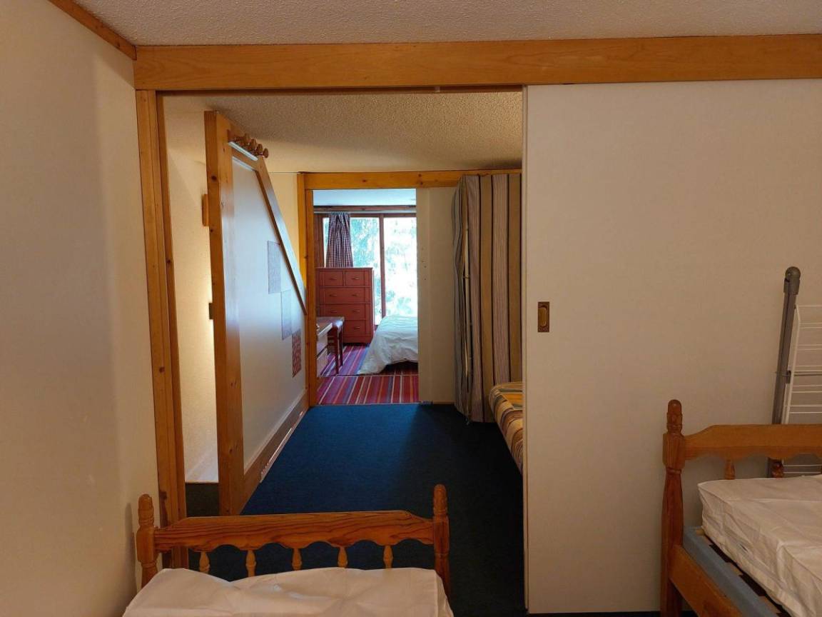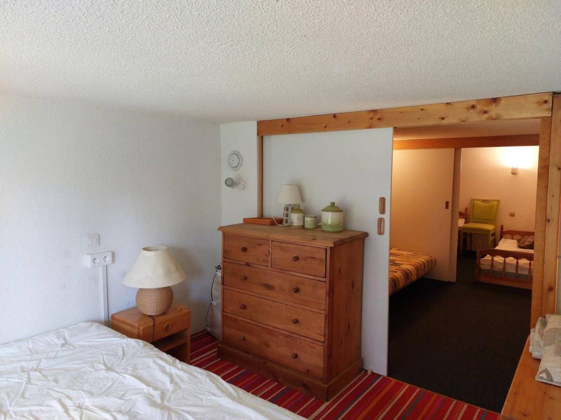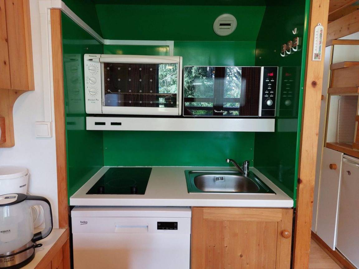 Fläche von ungefähr 42 m². 2te Etage. Orientierung : Nord, Nord-Ost, Ost, Süd. Blick berg (Mont Blanc). Niveau 0 : Wohnzimmer. Kochnische mit Wasserkocher, Kaffeemaschine, Backofen, Toaster, Geschirrspülmaschine, Mikrowellenherd, 2 Glaskeramikkochfelder, Kühlschrank. Badezimmer mit Badewanne, WC. Balkon. Niveau 1 : offener Schlafbereich mit Klappschlafcouch. Schlafzimmer mit Doppelbett. offener Schlafbereich mit 2 Einzelbetten (fermé).