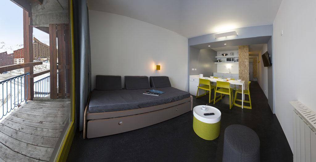 Fläche von ungefähr 29 m². 10te Etage. Orientierung : Süd-Ost, Süd. Wohnzimmer mit Ausziehschlafcouch für 2 Personen (2*), TV. offener Schlafbereich mit Ausziehschlafcouch für 2 Personen (80), 2 Stockbetten (80). Kochnische mit Wasserkocher, Kaffeemaschine (nespresso), kleiner Backofen mit Mikrowellenfunktion, Toaster, Geschirrspülmaschine, Induktionsherdplatten, Kühlschrank. Badezimmer mit Badewanne, WC. Balkon. Die oberen Betten sind nicht für Kinder unter 6 Jahren geeignet.