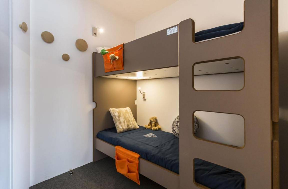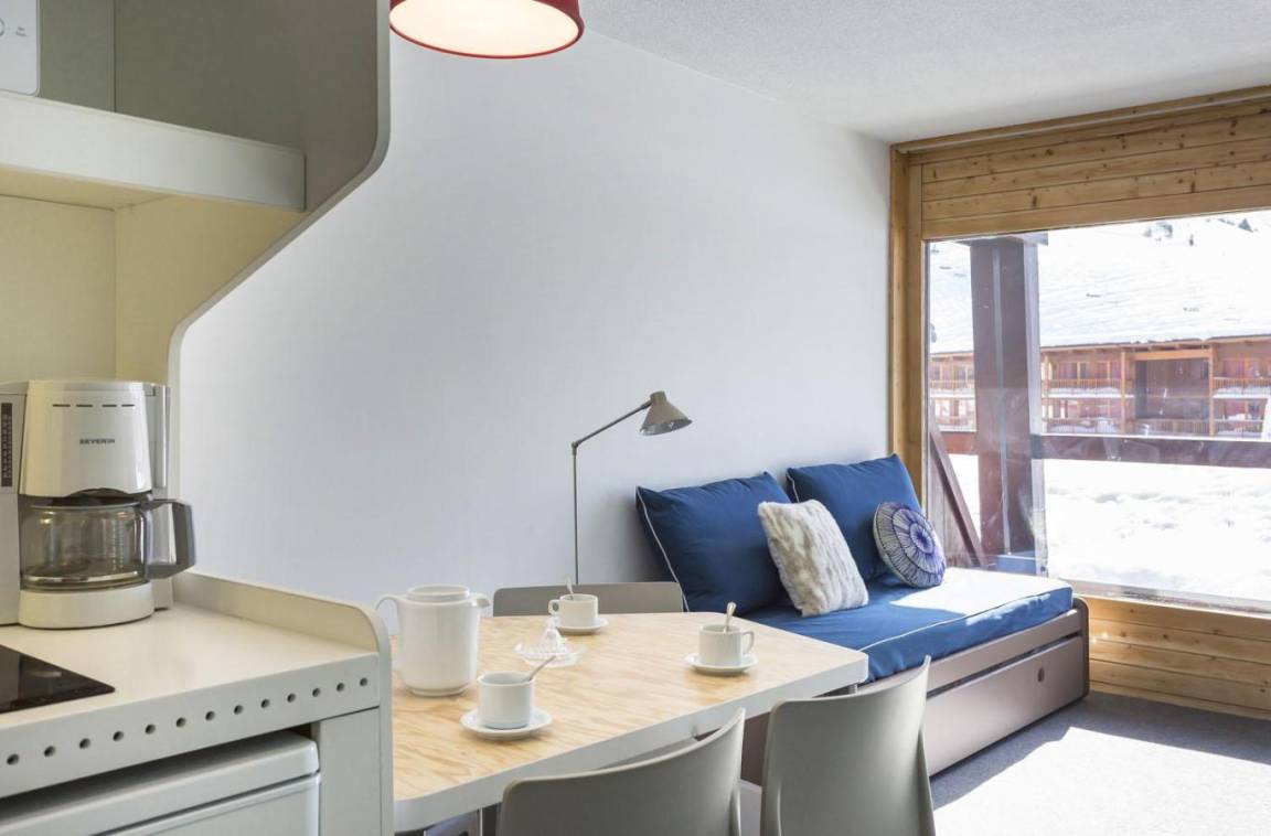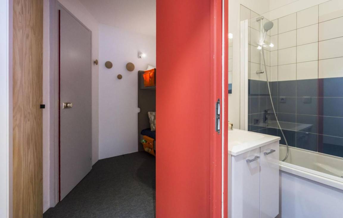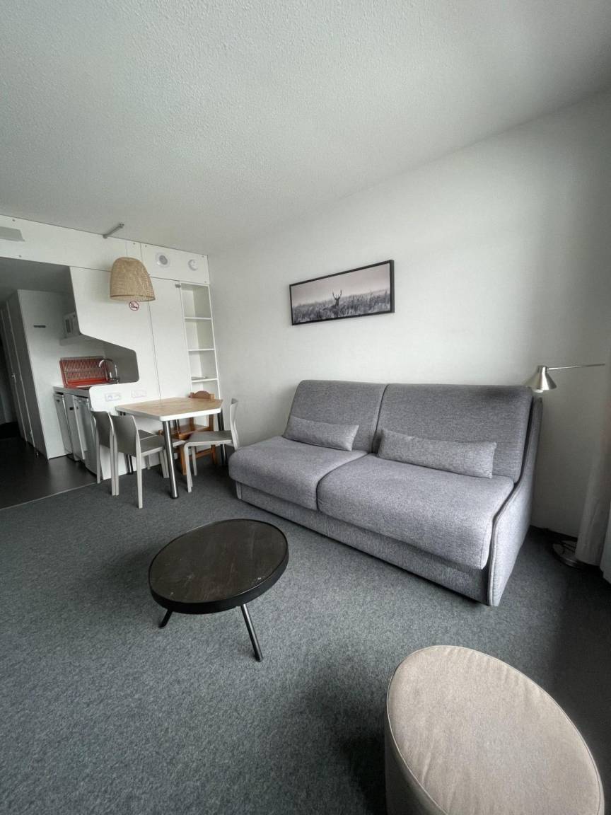 Fläche von ungefähr 26 m². 1te Etage. Orientierung : Süd-Ost. Wohnzimmer mit Klappschlafcouch (160), Schrank (pour les skis). offener Schlafbereich mit 2 Stockbetten (80). Kochnische mit Kaffeemaschine (filtre), kleiner Backofen mit Mikrowellenfunktion, Toaster, Geschirrspülmaschine, 2 Induktionsherdplatten, Kühlschrank. Badezimmer mit WC. Balkon. Die oberen Betten sind nicht für Kinder unter 6 Jahren geeignet.