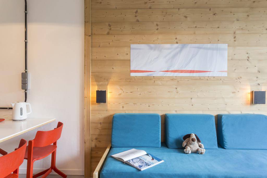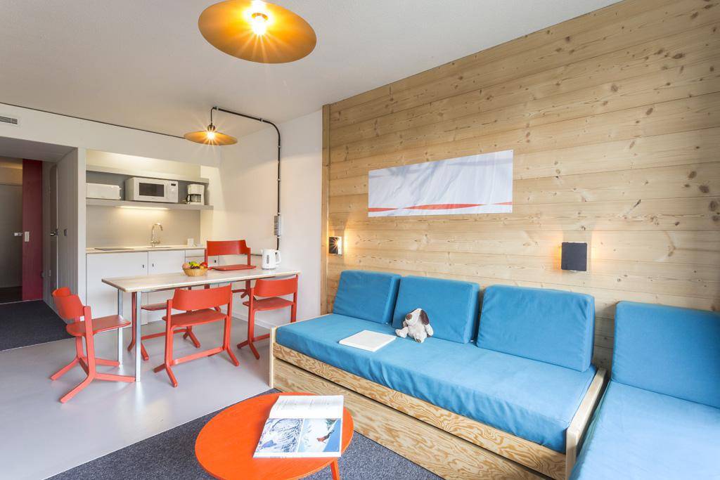 Fläche von ungefähr 27 m². 11te Etage. Orientierung : Süd. Wohnzimmer mit Ausziehschlafcouch für 2 Personen (2x80), TV. offener Schlafbereich mit Ausziehschlafcouch für 2 Personen, 2 Stockbetten. Kochnische mit Wasserkocher, Kaffeemaschine (filtre), kleiner Backofen mit Mikrowellenfunktion, Toaster, Geschirrspülmaschine, 2 Herdplatten, Kühlschrank. Badezimmer mit Badewanne, WC. Balkon. Die oberen Betten sind nicht für Kinder unter 6 Jahren geeignet.