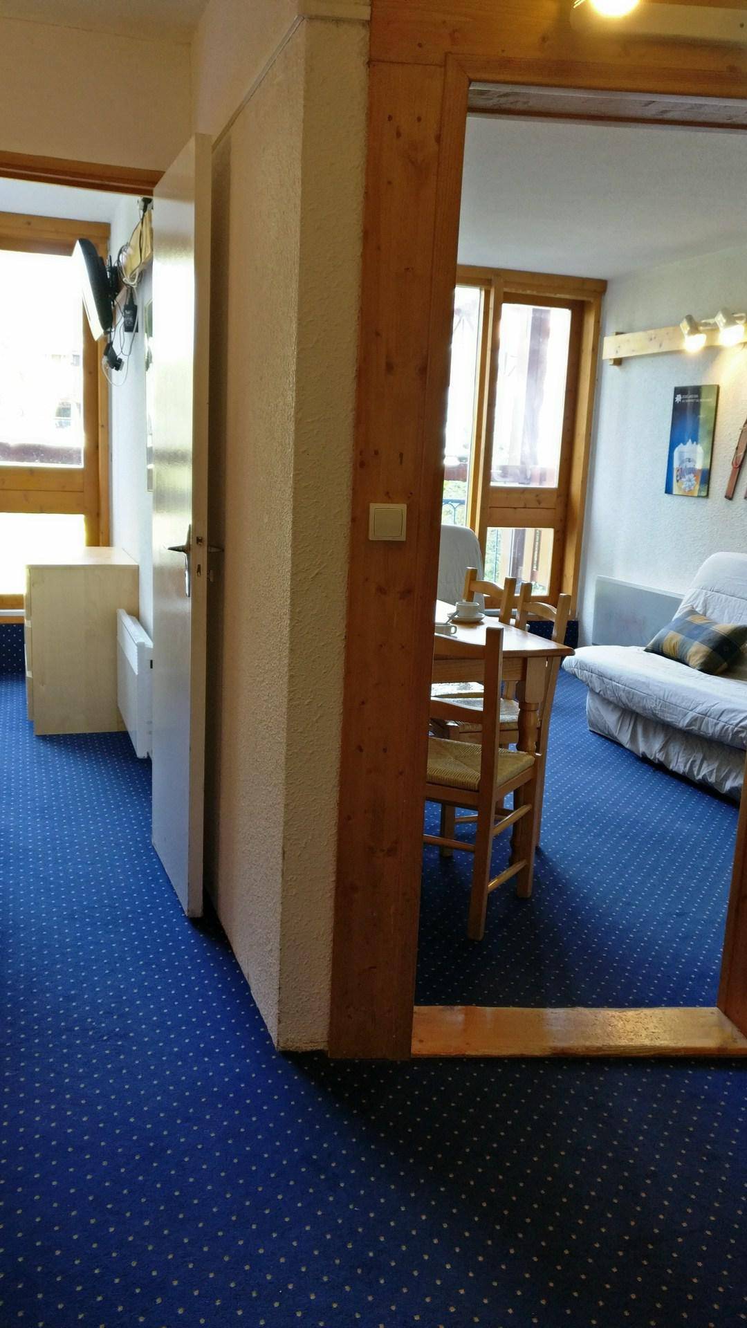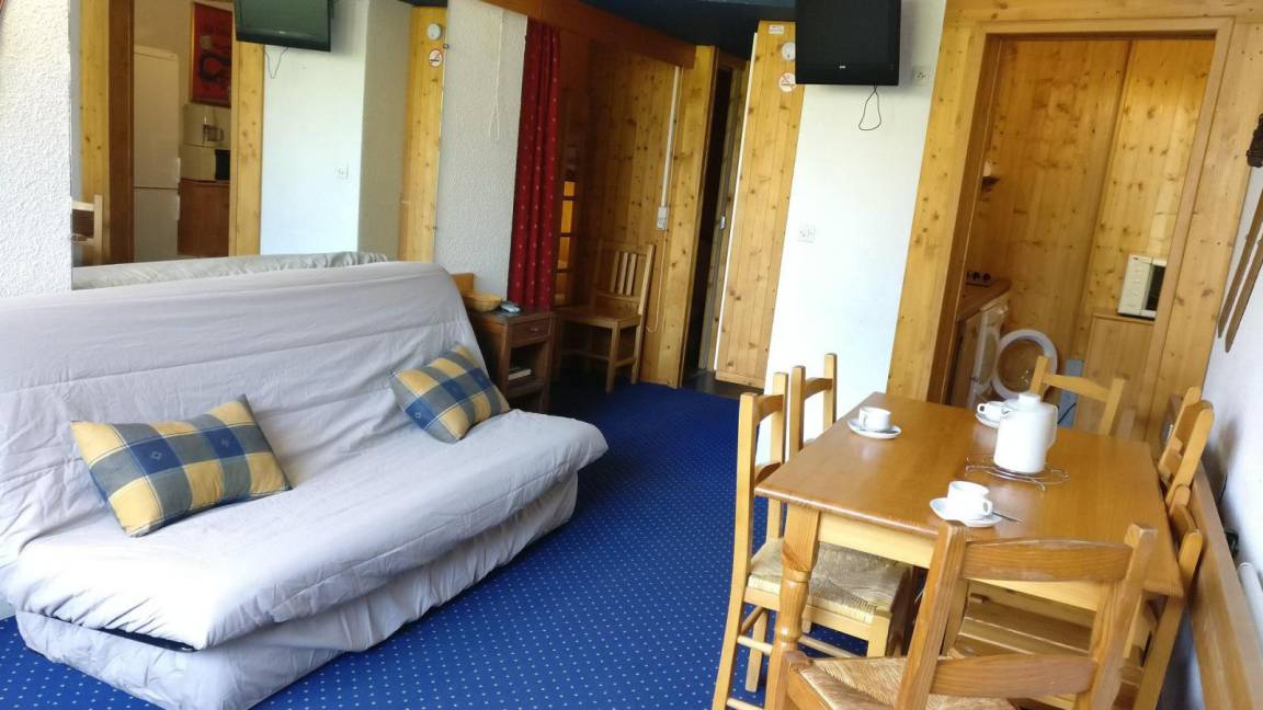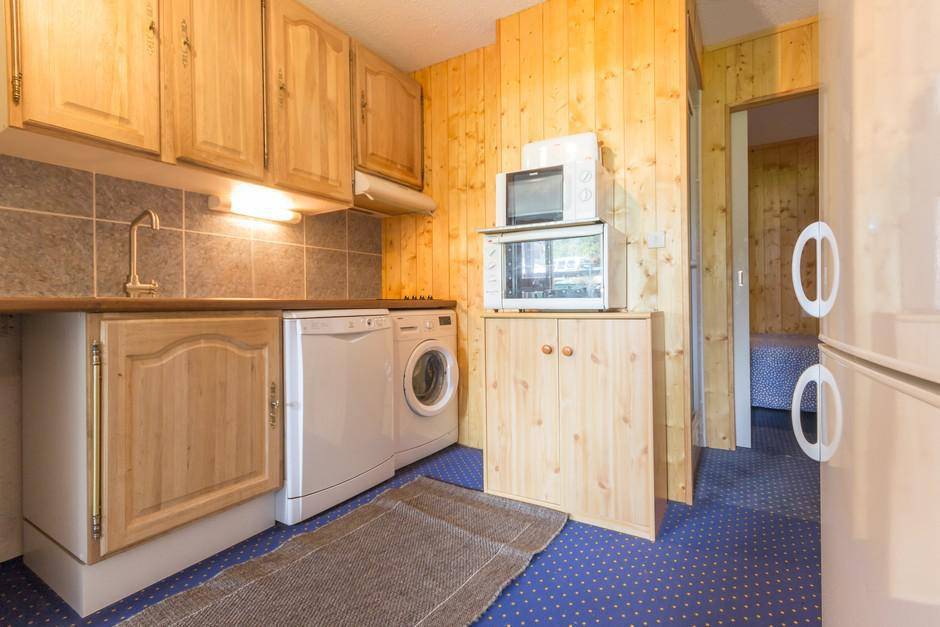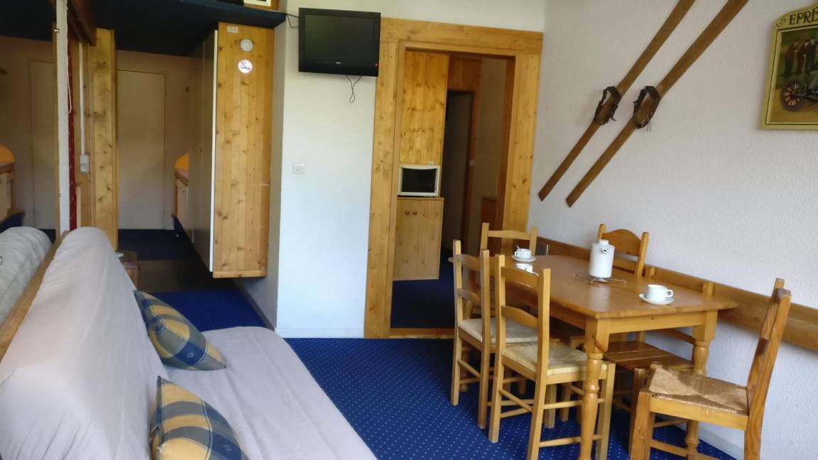 Fläche von ungefähr 50 m². 5te Etage. Orientierung : Nord, Nord-Ost, Ost. Wohnzimmer mit 2 Sofabetten (120). Schlafzimmer mit 2 Einzelbetten (90). Alkoven mit 2 Stockbetten. Alkoven mit Einzelbett. offener Schlafbereich mit Doppelbett (140), . Kochnische mit Wasserkocher, Kaffeemaschine (filtre), Backofen, Toaster, Waschmaschine, Geschirrspülmaschine, Mikrowellenherd, kleiner Backofen, Glaskeramikkochfelder, Kühlschrank. Waschräume. Badezimmer mit WC. separates WC. Balkon. Die oberen Betten sind nicht für Kinder unter 6 Jahren geeignet.