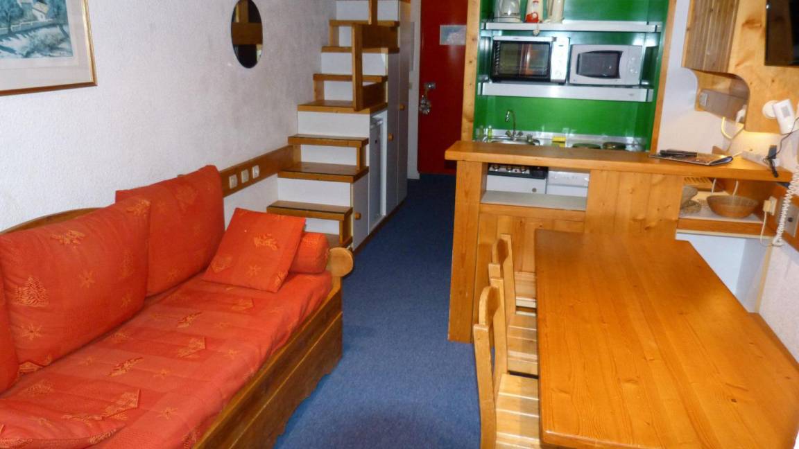Fläche von ungefähr 35 m². 2te Etage. Orientierung : Ost, Süd-Ost, Süd. Niveau 0 : Wohnzimmer mit einfache Klappschlafcouch (80*190). Kochnische mit Wasserkocher, Kaffeemaschine, Backofen, Toaster, Geschirrspülmaschine, Mikrowellenherd, Kühlschrank. Badezimmer mit Badewanne, WC. Balkon. Niveau 1 : offener Schlafbereich mit 2 Stockbetten (80*190). Schlafzimmer mit Doppelbett (140*190). Mansardenzwischengeschoss (-1,80 m) mit Waschbecken, WC. Die oberen Betten sind nicht für Kinder unter 6 Jahren geeignet.