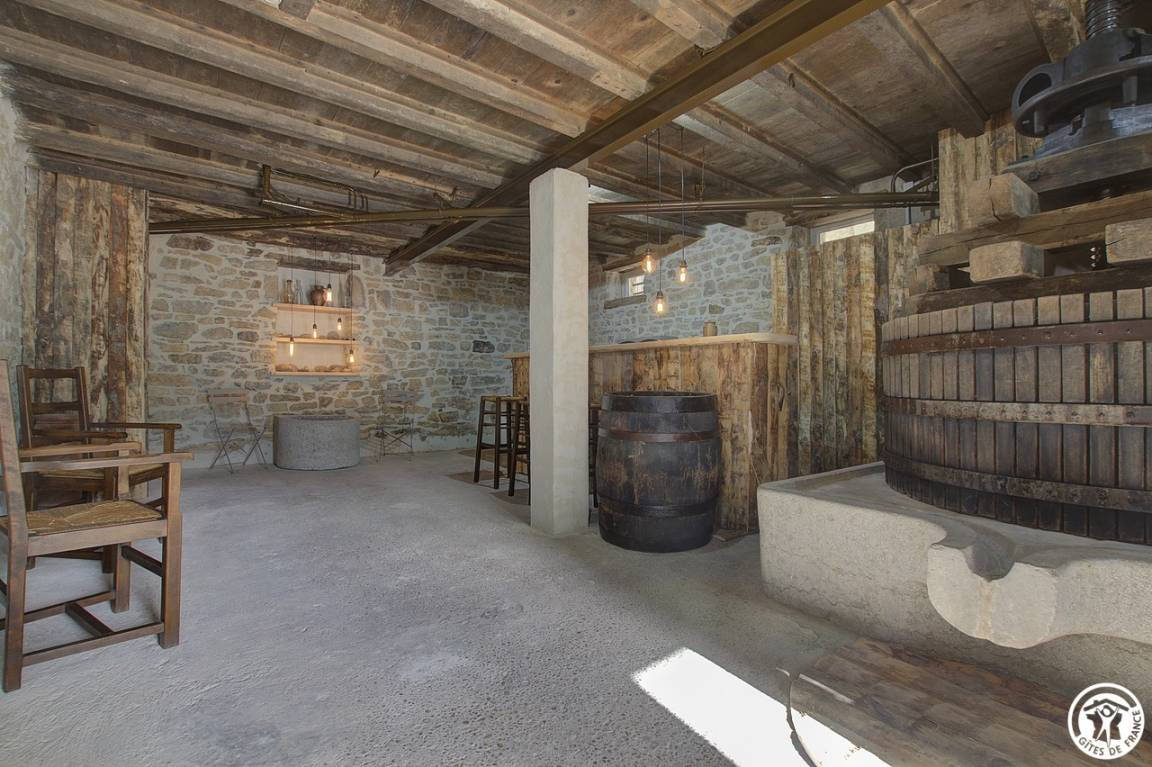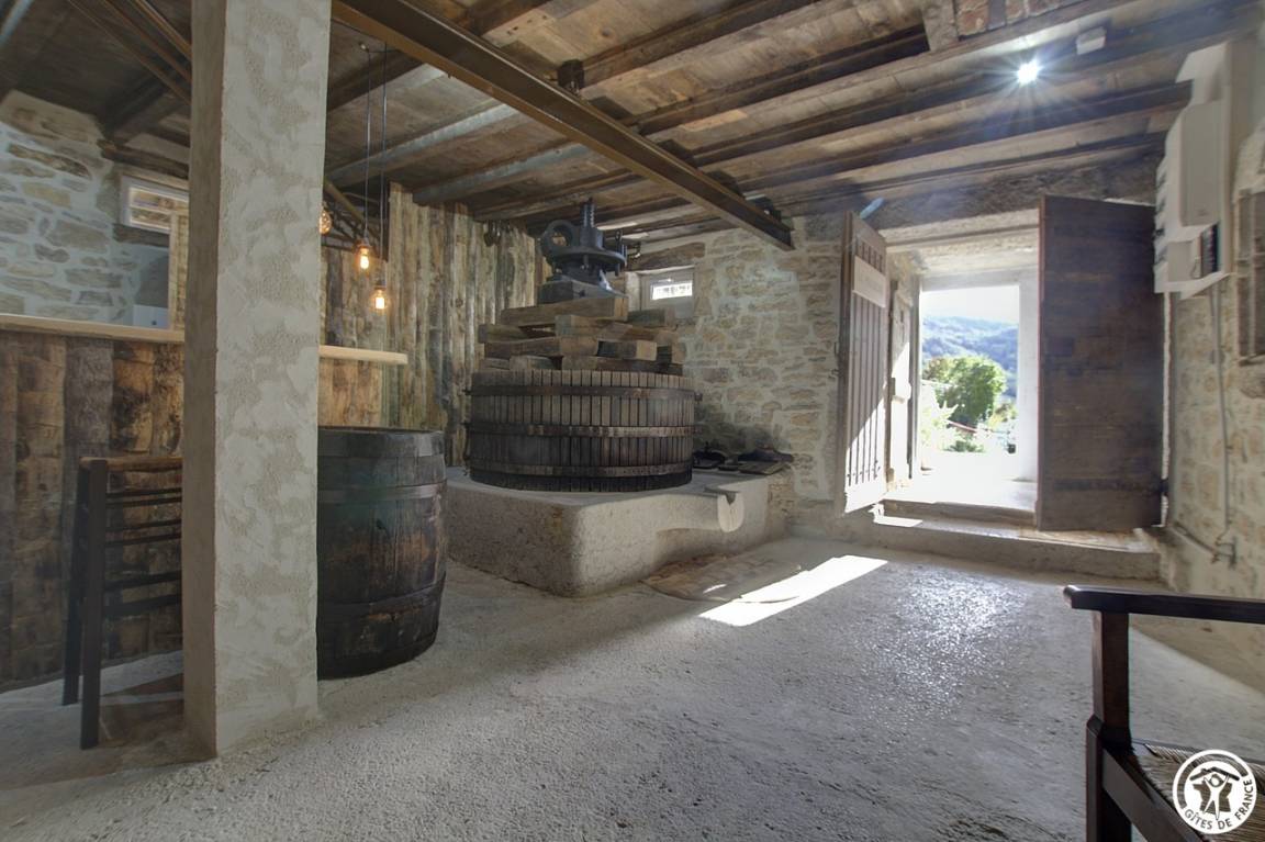 Schon bei Ihrer Ankunft werden Sie vom einzigartigen Charakter dieses Ortes fasziniert sein. Im Erdgeschoss lädt eine restaurierte Weinpresse zu Momenten der Gelassenheit ein. Eine Außentreppe aus Stein führt Sie zu einer überdachten Terrasse, die einen atemberaubenden Blick auf die umliegende Landschaft bietet. Im Inneren öffnet sich eine voll ausgestattete Küche zum Wohnzimmer mit einem schönen Kamin mit Holzofen, ideal für gesellige Abende.
