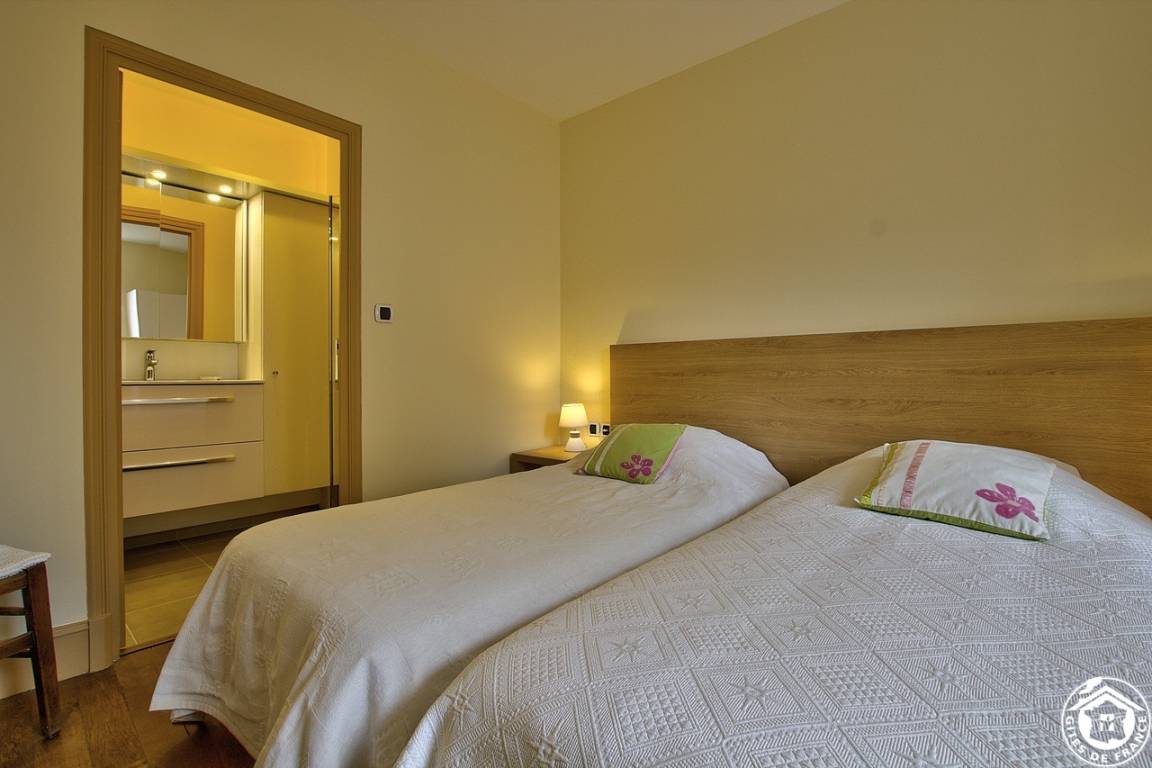 Auf der zweiten Ebene begrüßen Sie zwei Schlafzimmer mit eigenen Badezimmern, die jedem Privatsphäre und Komfort bieten. Das erste besteht aus 2 90*190 Betten. Das zweite verfügt über ein 160 x 20