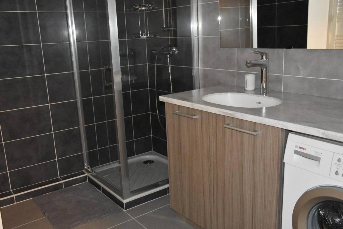 Fläche von ungefähr 54 m². Orientierung : Süd. Wohnzimmer mit einfache Klappschlafcouch (140). Schlafzimmer mit Doppelbett (140). Kochnische mit Backofen, Geschirrspülmaschine, Mikrowellenherd, 2 Induktionsherdplatten, Kühlschrank. Waschräume mit Dusche, Waschmaschine. separates WC. Terrasse.