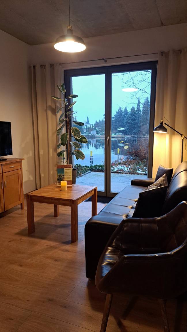 Der Wohnraum ist in einen gemütlichen Wohnbereich und einen Eßbereich in Küchennähe aufgeteilt. Im Wohnbereich befindet sich eine Schlafcouch mit integrierter Matratze (Express-Bett) und ein Flachbildfernseher mit Breitbandkabel-TV Versorgung. Ebenfalls findet man dort den Zugang zur Außenterrasse / Balkon mit Blick aufs Wasser.