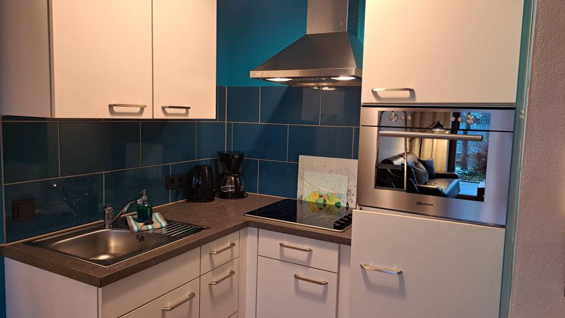 Zum Kochen bietet das Apartment eine Küche mit einem Kühlschrank mit integriertem Gefrierfach, einem Ceranherd mit 4 Kochzonen sowie einem Backofen mit Mikrowellenfunktion. Sie ist komplett mit Geschirr, Kochutensilien und Küchengeräten wie z.B. Kaffeemaschine ausgestattet.