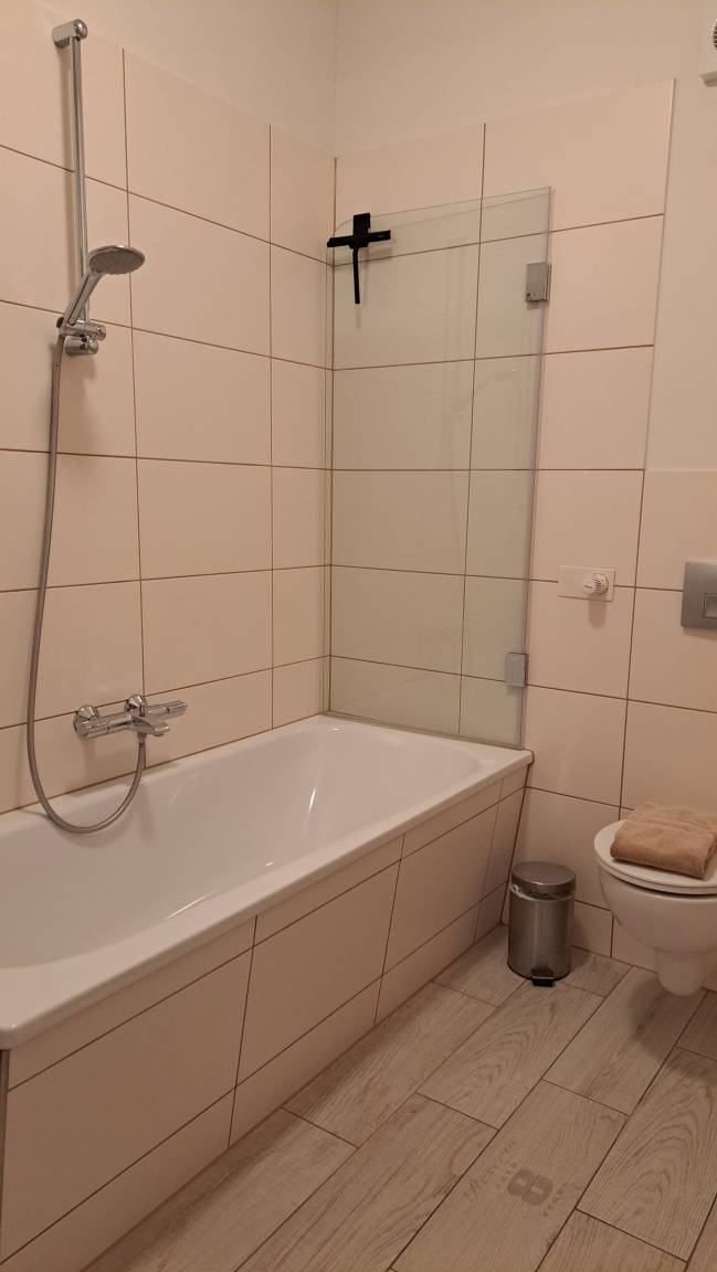 Sie hat eine Größe von ca. 45m² und besteht aus einem Wohnzimmer mit offenem Küchenbereich, einem Schlafzimmer mit Doppelbett in Komfortsitzhöhe zum erleichterten Aufstehen und Hotelkomfortmatratze, Kofferablage und Kleiderschrank sowie einem Bad mit einer Badewanne, WC und Waschbecken.