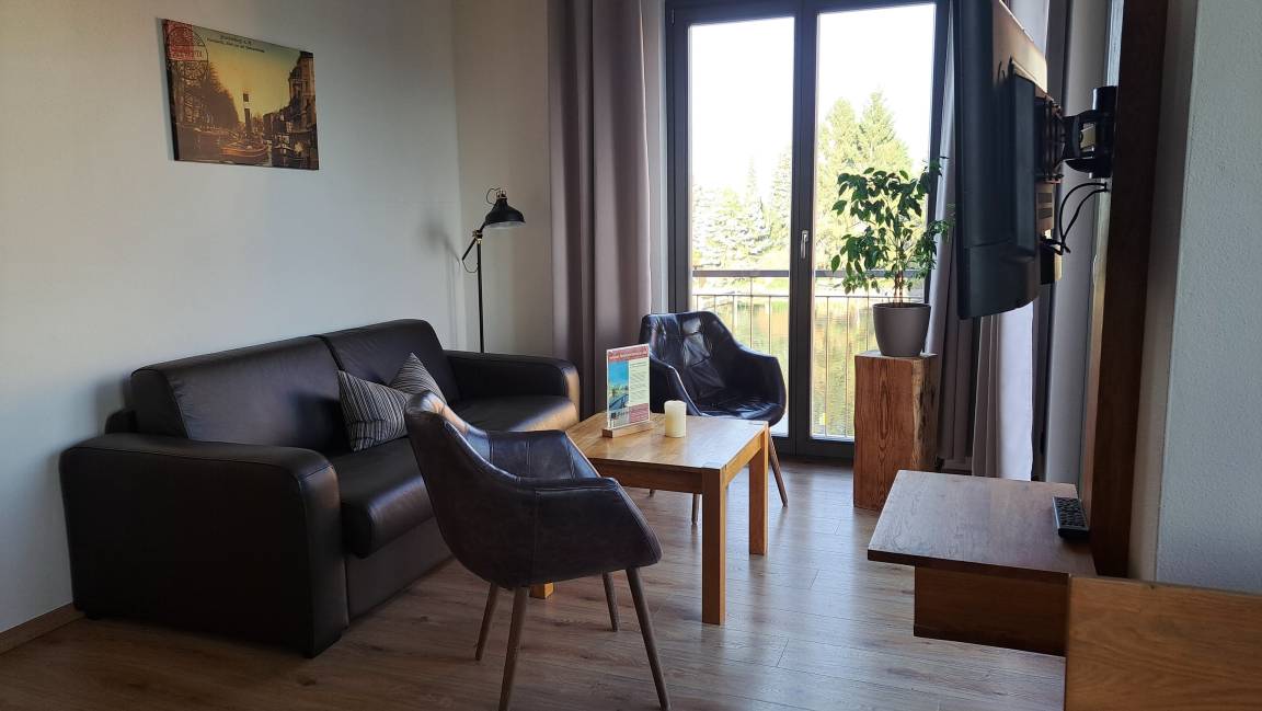 Es hat eine Größe von ca. 51m² und besteht aus einem Wohnzimmer mit offenem Küchenbereich, einem Schlafzimmer mit Doppelbett in Komfortsitzhöhe zum erleichterten Aufstehen und Hotelkomfortmatratze, Kofferablage und Kleiderschrank sowie einem Bad mit ebenerdiger Dusche, WC und Waschbecken.