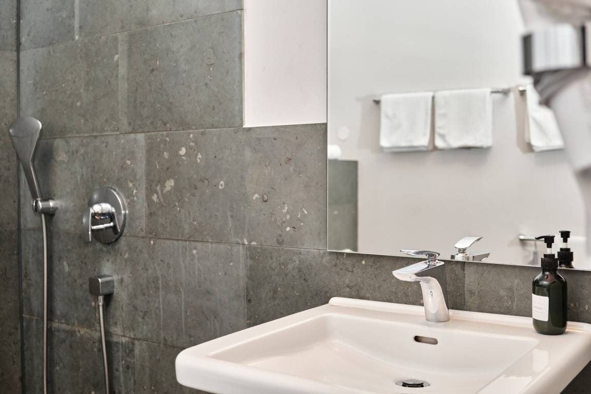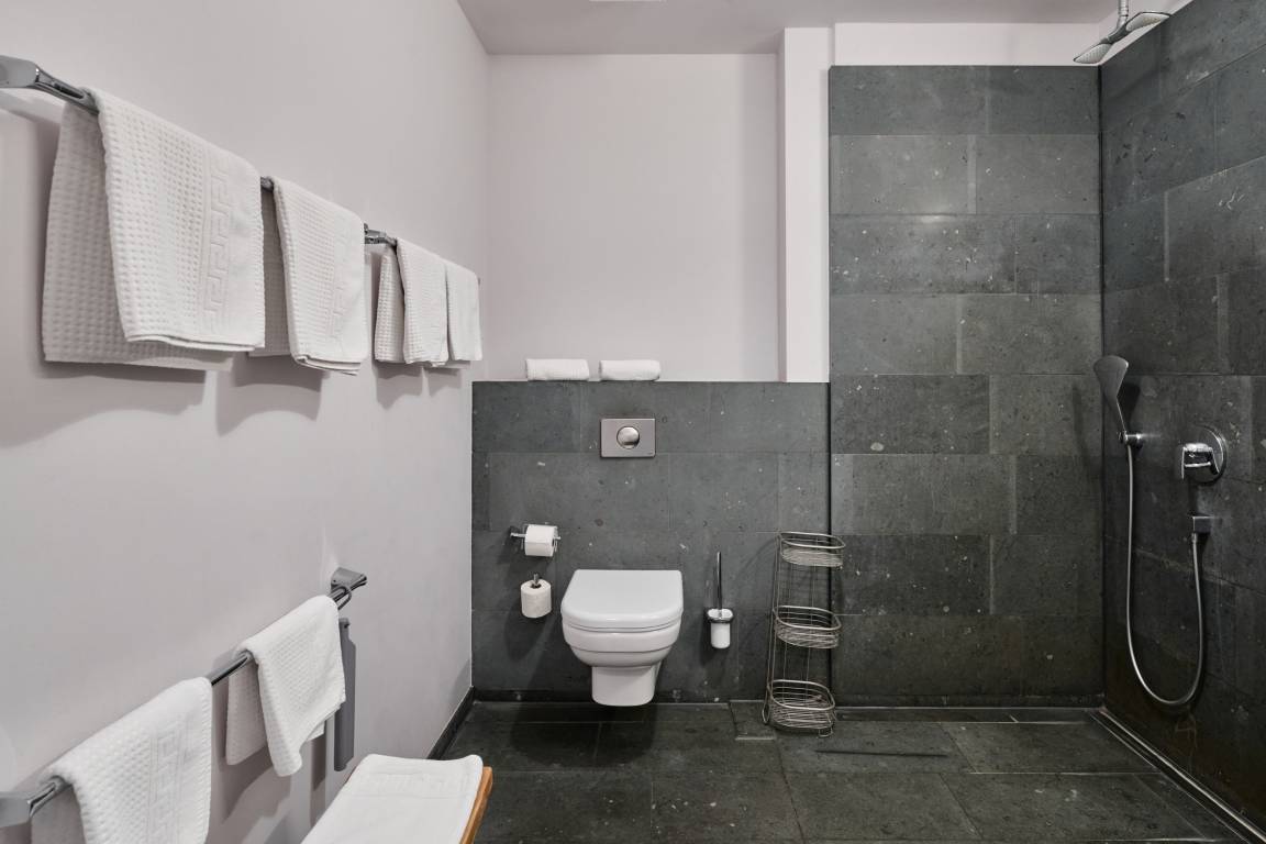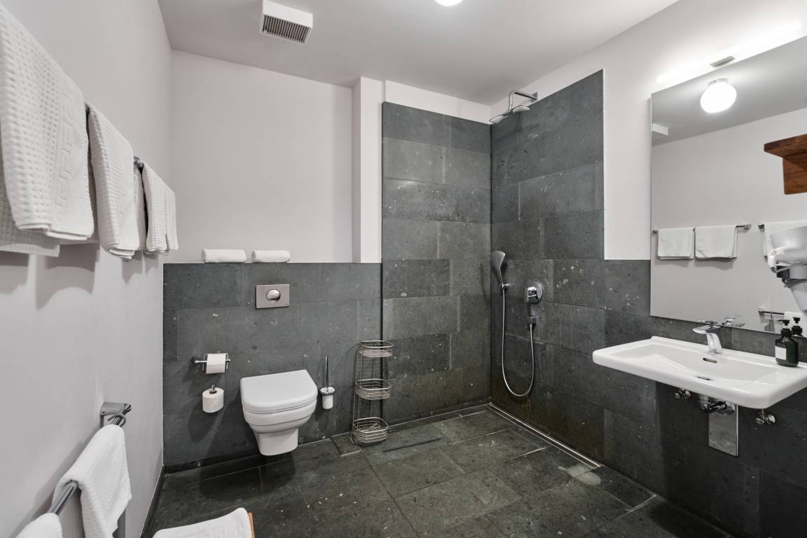 Die bodengleiche Dusche verfügt neben der Schlauchbrause auch über eine „Regenkopfdusche". Das Waschbecken ist mit einem gut ausgeleuchteten, großformatigen Spiegel versehen. Das es für Rollstuhlfahrer unterfahrbar ist, ist für uns selbstverständlich. Zur Ausstattung des Bades gehört auch ein Fön. Hand- und Duschtücher liegen für Sie bereit.
